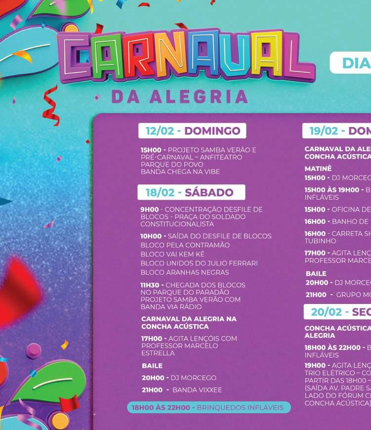A Prefeitura abriu chamamento público para a exploração de espaços públicos, visando a comercialização de alimentos e bebidas, durante a programação do Carnaval da Alegria. Mais