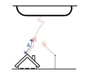 Por fim, no instante t₂, ocorre o encontro entre o líder ascendente emitido por uma edificação e o líder descendente proveniente da nuvem. Essa conexão completa o canal condutor entre a nuvem