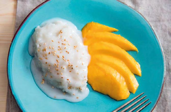 Este postre combina arroz glutinoso, mango maduro y leche de coco, equilibrando dulzor y notas salinas. Vinculado a la cosecha del mango, es una preparación típica de la cultura tailandesa durante el verano.