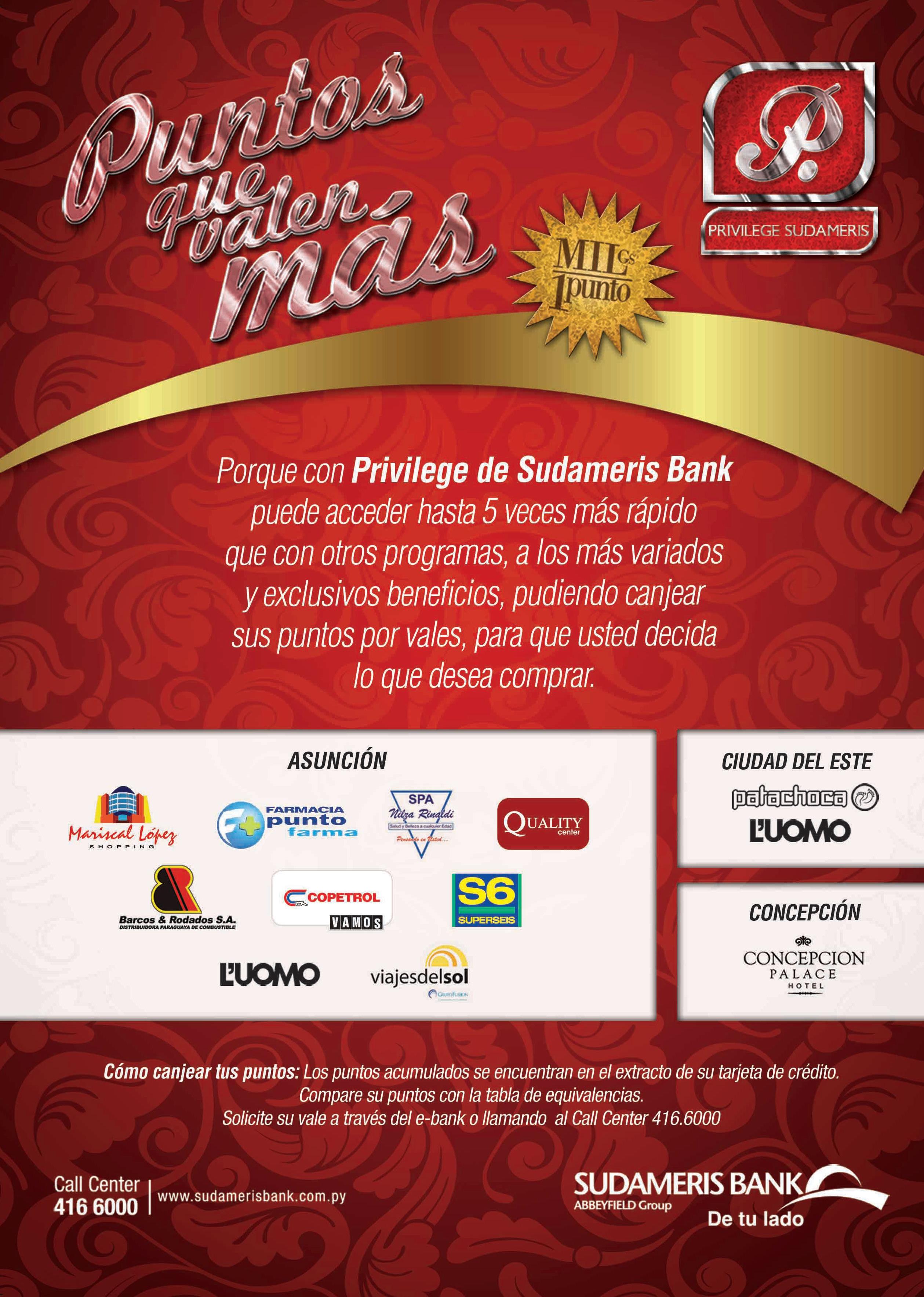 Direccionario de Anunciantes SUMARIO L’uomo: www.luomo.com.py Nat Consultores: www.natconsultores.com.ar Pechugón: www.pechugon.com.py Petrobras: www.petrobras.com Prestigio Automóviles: www.audi.com.py Revista PLUS: www.revistaplus.com.py Banco Itaú: www.itau.com.py Caja Médica: www.cajamedica.com.py Century: www.century.com.py Diesa: www.diesa.com.py INCAE Business School: www.incae.edu La Consolidada: www.laconsolidada.com.py Samsung: www.samsung.com.py Sancor: www.gruposancorseguros.com.py Sudameris Bank: www.sudameris.com.py Totvs: www.totvs.com Xerox: www.xerox.com revistaplus RevistaPLUSPY Management. El trabajo a distancia. Infraestructura.