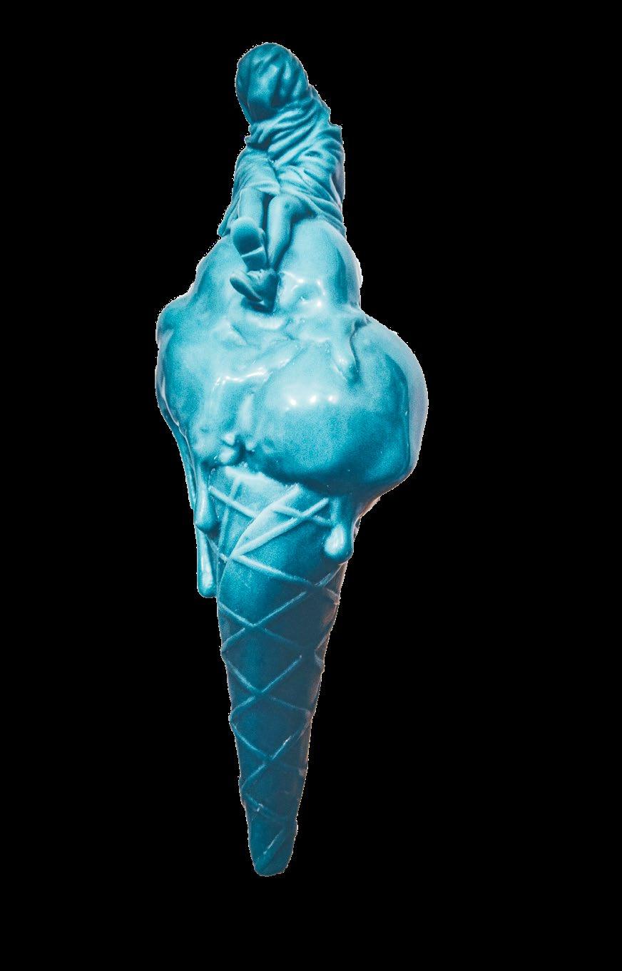 cultura, se suele recurrir a símbolos, como una paloma blanca o un haz de luz, pero también como encarnación en la figura del Cristo. Y no como ahora nos lo presenta, y representa, Ramsés Ruiz, a través de una humilde figura cubierta hasta las piernas, sentada en unas bolas de helado colocadas sobre un cono.