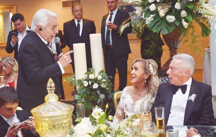 Ya en la fiesta, todos disfrutaron de una deliciosa cena de 4 tiempos, así como la música de Banda Europa. Aunque uno de los mayores regalos a los festejados fue la presencia del cantante Enrique Guzmán, quien interpretó para los novios sus temas como: “Tu Cabeza en mi Hombro”, “Payasito”, así como los hits de los sesentas “Popotitos”, “Rock de la Cárcel” y “La Plaga” entre otros temas del famoso cantante.