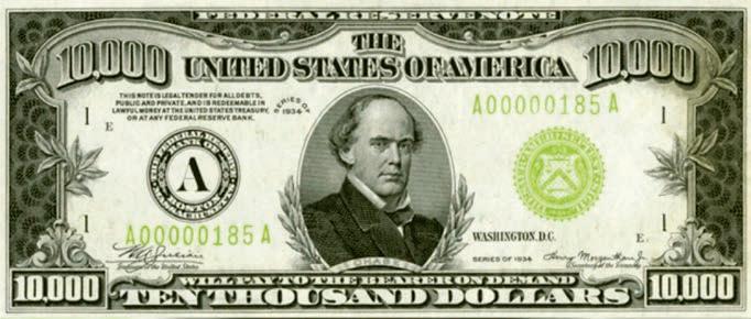 Uma raríssima nota de US$ 10.000 foi arrematada por US$ 480.000 em recente leilão na casa de leilões Heritage Auctions, em Dallas, EUA. A nota emitida em 1934, época da Grande Depressão, nunca esteve em circulação e foi certificada pela Paper Money Guaranty (PMG), recebendo classificação excepcional. As notas de valores altos, como as de US$ 500 ou mais foram caindo em desuso devido à falta de circulação e acabaram sendo descontinuadas em 1969.
