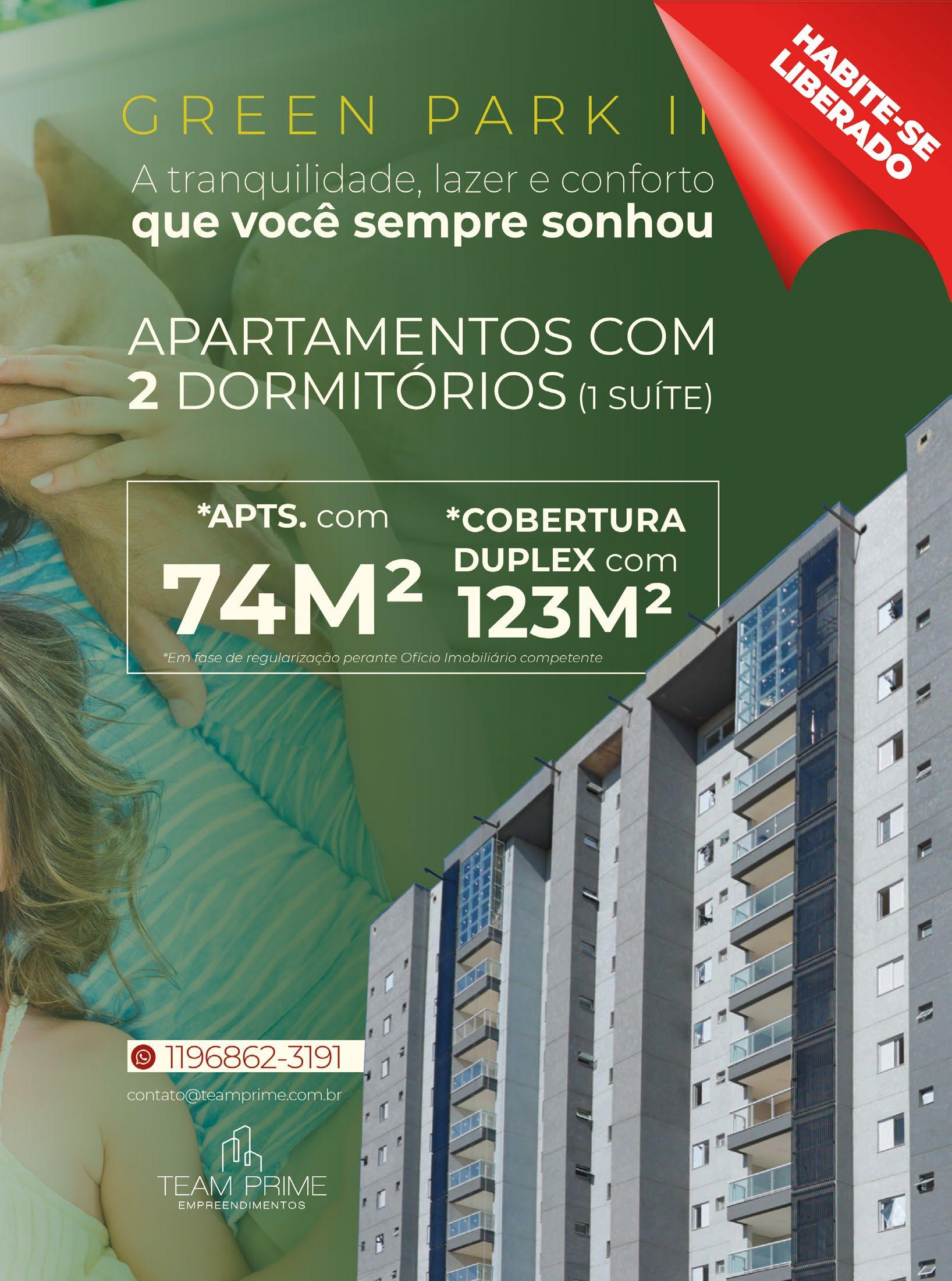 Trata-se de um prédio com estrutura completa de lazer e qualidade de vida em um terreno de 2.605 m² cercado de muito verde, ar puro e tranquilidade, muito bem localizado e próximo a tudo. Os apartamentos de dois dormitórios possuem 74 m² com varanda gourmet e chur rasqueira ecológica. O edifício conta ainda com quatro coberturas duplex de 123 m². Todas elas têm também estrutura para ar condicionado e vagas na garagem. O Green Park II Residencial oferece completa área de lazer e bem-estar com brinquedoteca, piscina, salão de festas, salão de jogos, home cinema e academia, tudo para garantir aos proprietários a melhor experiência.