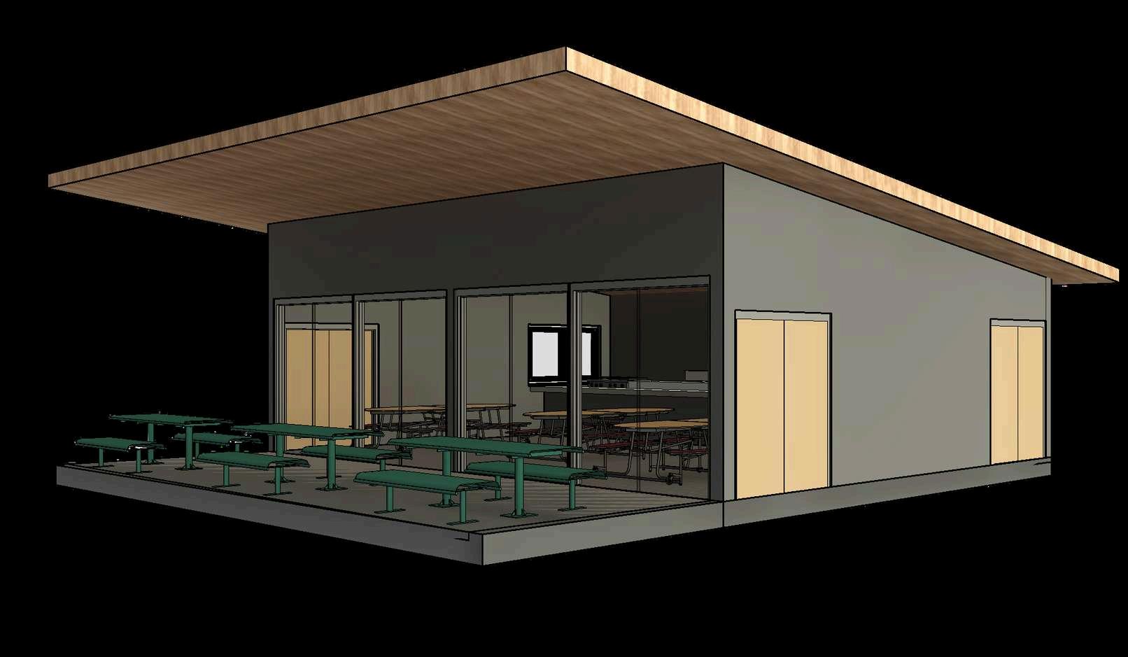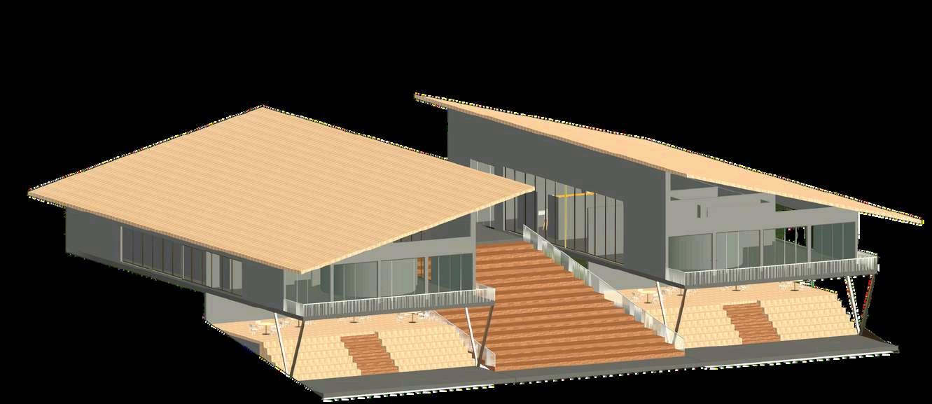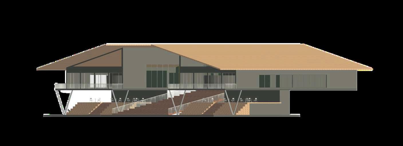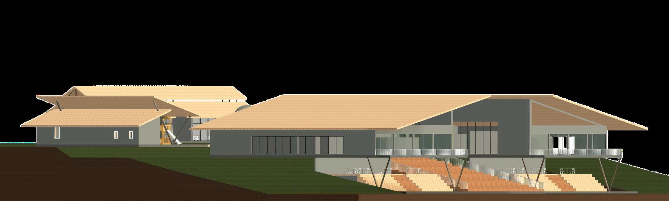 Compuesto por dos volúmenes simétricos enfrentados, se posiciona sobre un terreno en pendiente, lo que permite generar un volado de 5 metros. Este espacio se aprovecha con una serie de gradas que conectan visual y físicamente con la cancha de fútbol y la cafetería cercana, creando un área de sombra, descanso y convivencia.