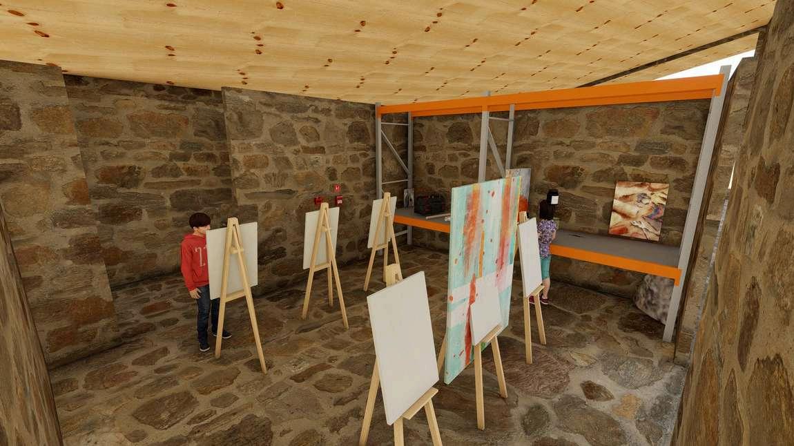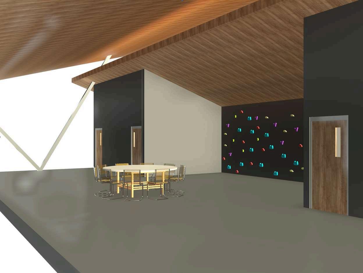 Esta área exterior se convierte en el corazón del edificio: un espacio cubierto pero libre, con una mesa redonda al centro que invita a la conversación, la toma de decisiones colectivas y la organización de actividades. Frente a esta zona, una pared escalable de uso recreativo añade un toque lúdico, perfecto para fortalecer el espíritu activo y aventurero de los scouts.
