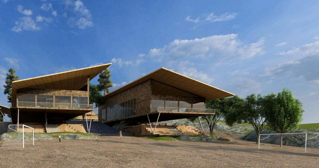 El conjunto está tejido con una lógica clara pero sensible: la materialidad compartida —piedra en los muros, madera en las cubiertas— evoca tradición, resistencia y calidez. Las losa inclinadas que identifican al proyecto no solo resuelven el clima y el terreno, también son un símbolo: apuntan hacia el cielo, pero siempre en diálogo con la tierra, como la gente de Yuguelito.