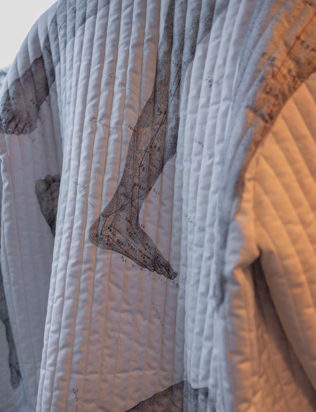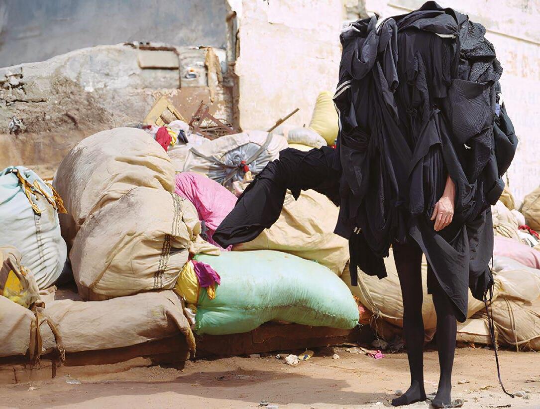 Eu me interesso em vez disso pela desconstrução e reconstrução de tecidos que já foram usados e têm uma história para contar, e para criar uma nova imagem a partir deles. A grande indústria da moda se presta a essa abordagem. Ao contrário da tinta, as roupas já são feitas em grandes quantidades e diversos designs, seria um desperdício não usá-las.