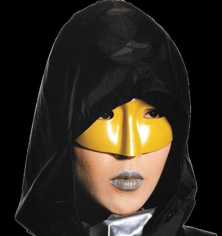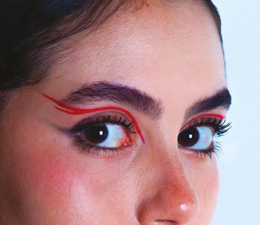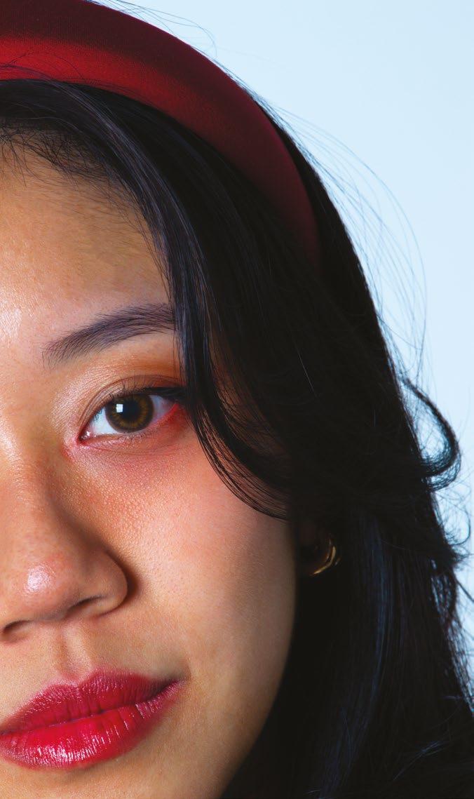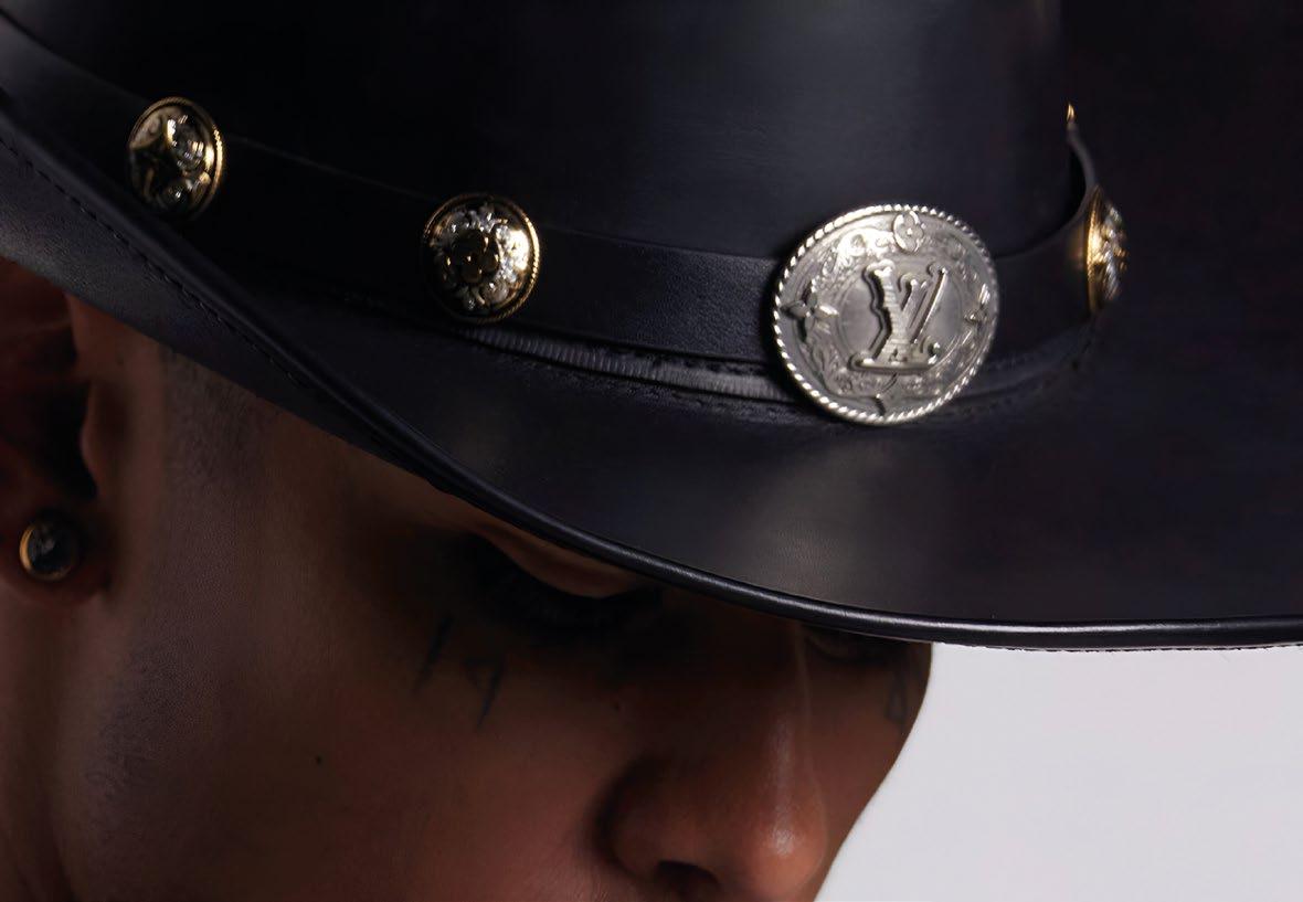 up da modelo com tinta no rosto e usando o chapéu da coleção, imagem conceito da coleção Retalhos de Hana