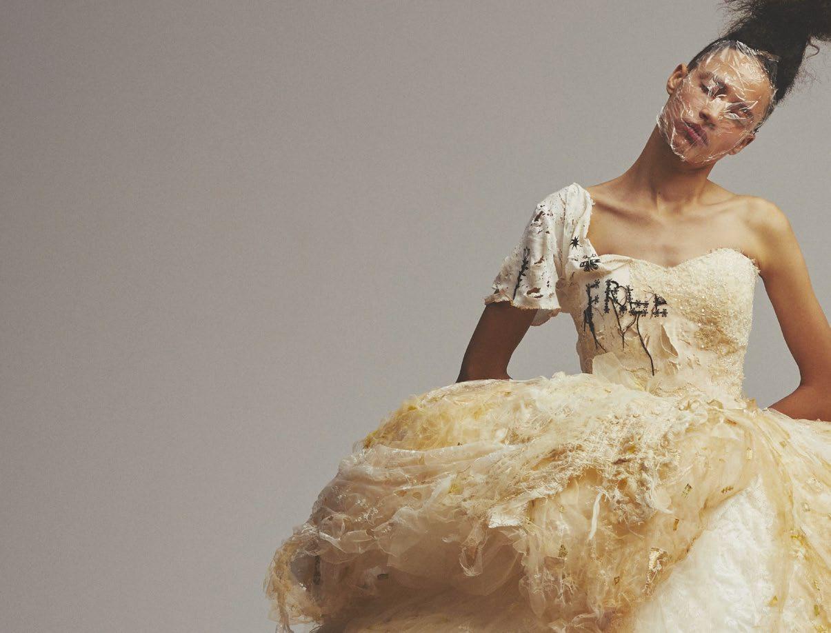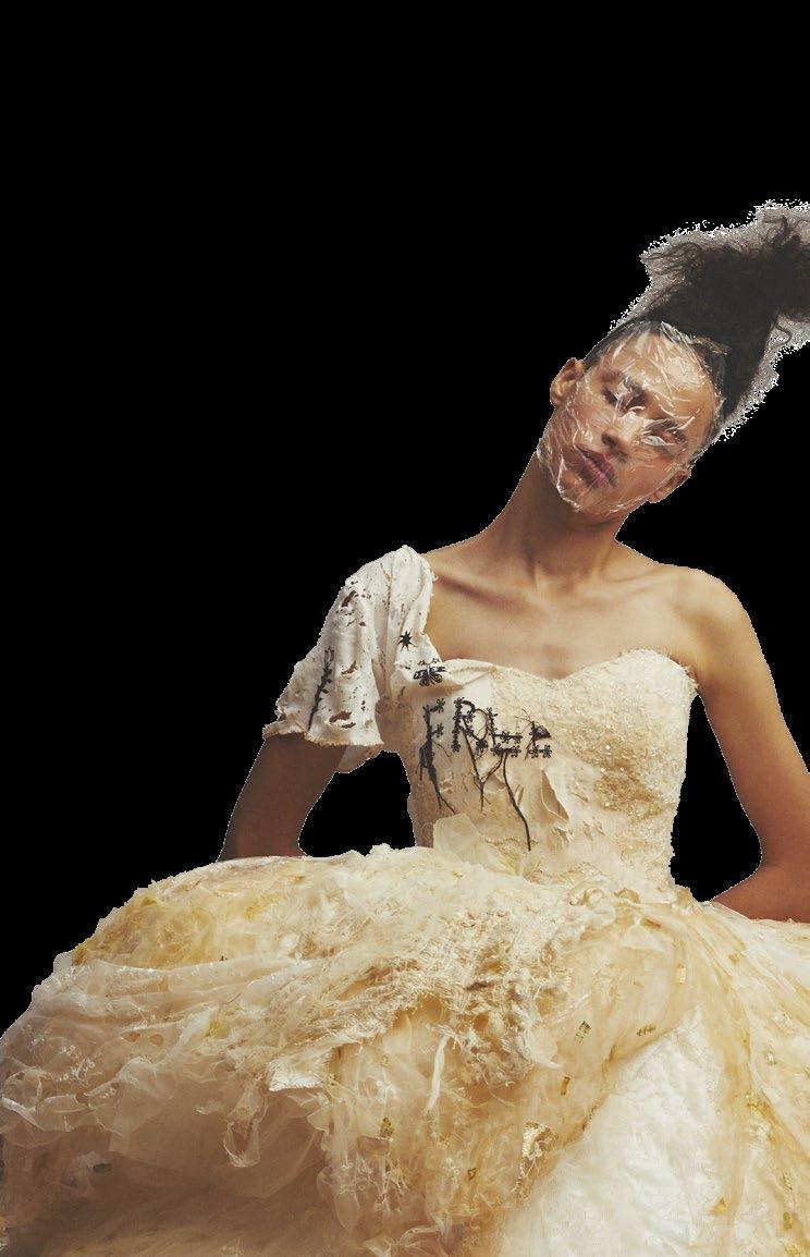Conceito de lookbook do vestido branco da coleção Retalhos de Hana Yagi,uma releitura do vestido de casamento.