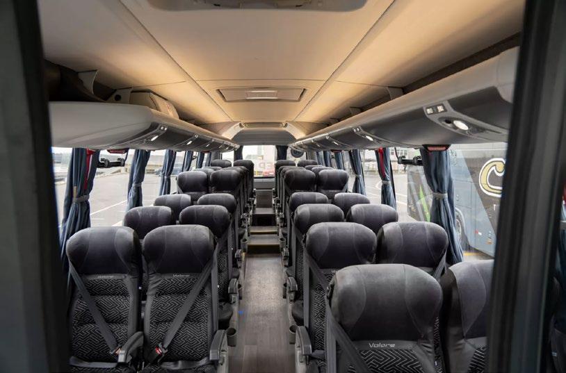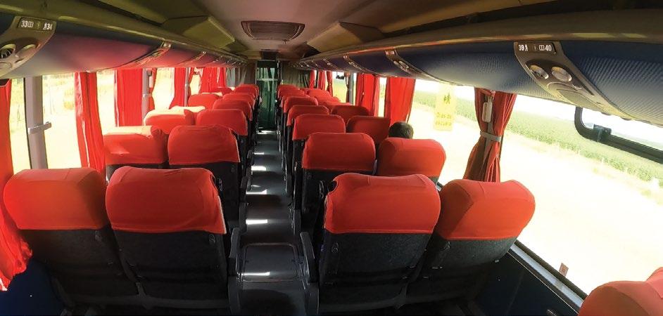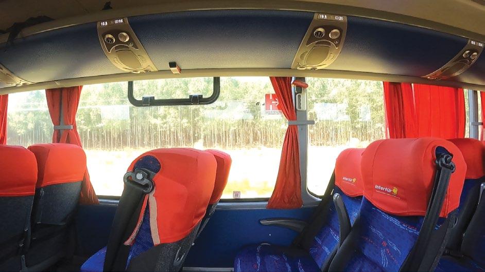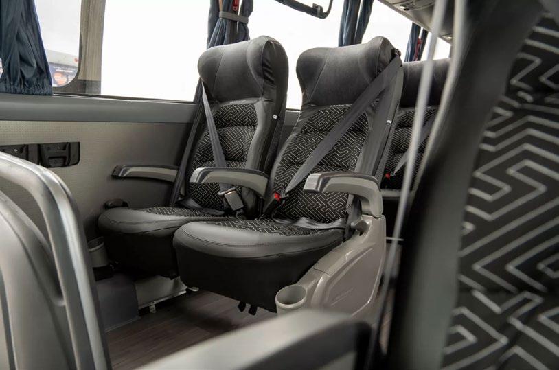 Del interior se destacan los 50 asientos ejecutivos soft G8 con reposa pies tipo balancín. Todas las butacas incluyen cinturón de seguridad de tres puntas retráctil; el asiento del conductor, marca Isrinhausen, cuenta con apoya cabeza, suspensión neumática y cinturón de seguridad retráctil de tres puntas.