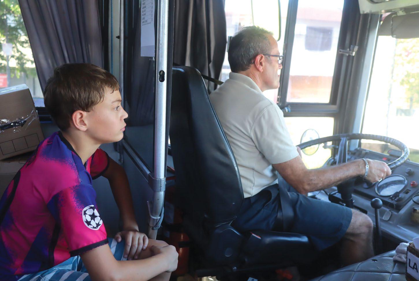 Alberto Sarti, conductor, cobra los pasajes antes de partir; si bien no tiene guarda el servicio, Alberto va acompañado de su hijo, Felipe, que ayuda a su padre y a los pasajeros.