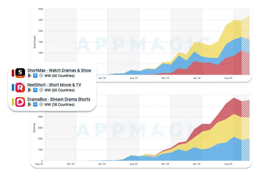 According to the China Netcasting Services Association, microdramas generated approximately CNY 50.5 billion (~US$6.95 billion) in 2024, surpassing domestic box office sales for the first time. Data from Sensor Tower shows that since the start of 2024, inapp revenue from short drama apps has grown rapidly, increasing from USD $178 million in Q1 2024 to nearly USD $700 million in Q1 2025, almost quadrupling the market. As of March 2025, global cumulative in-app revenue from short drama apps reached approximately USD $2.3 billion.