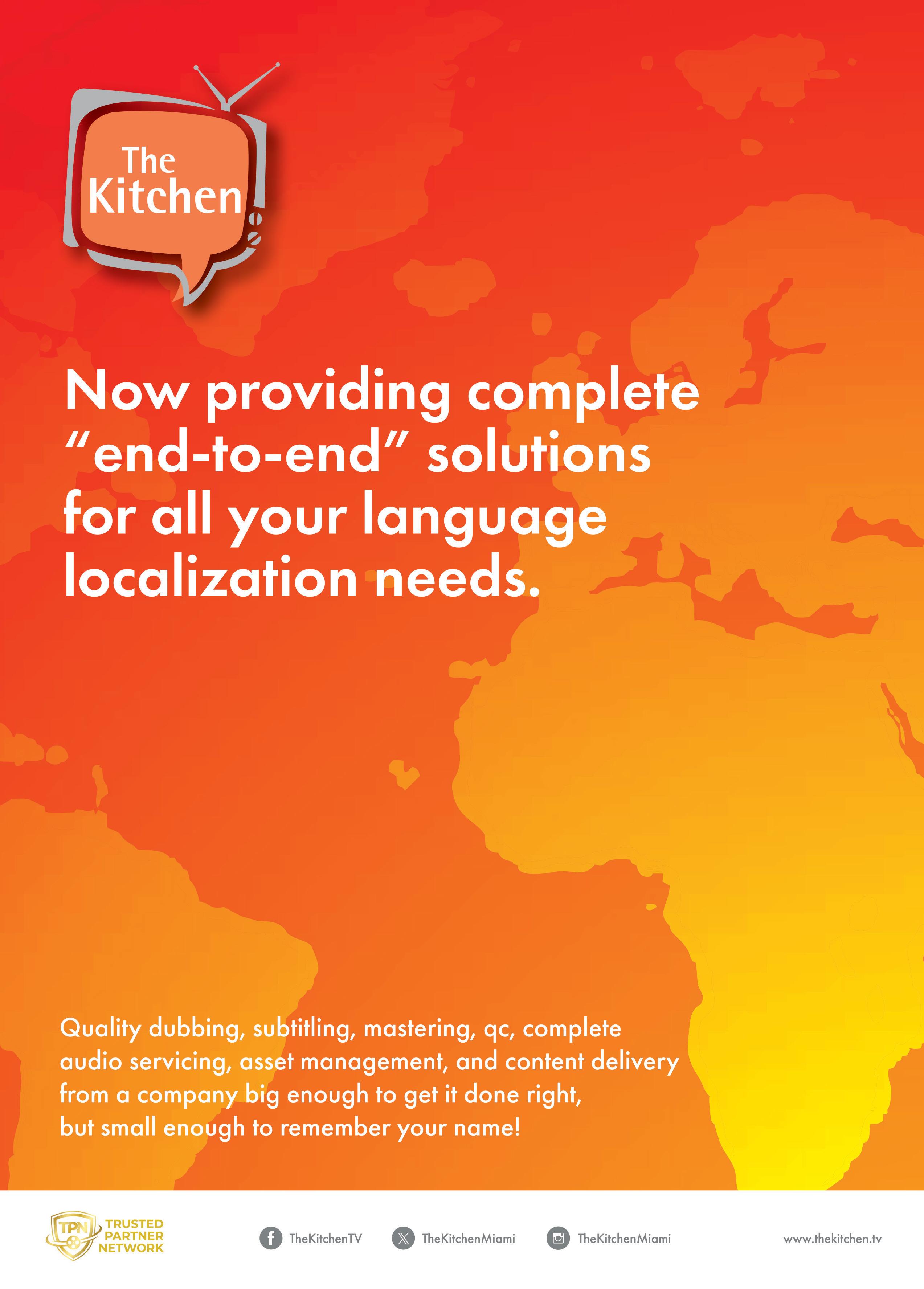 For more than 24 years, The Kitchen, a Miami-based language localization studio, has taken pride in its English dubbing team, which continues to grow in size, technology, and reputation. The studio features 11 dubbing suites at its headquarters, backed by a dedicated team of Englishlanguage directors and a vast,
