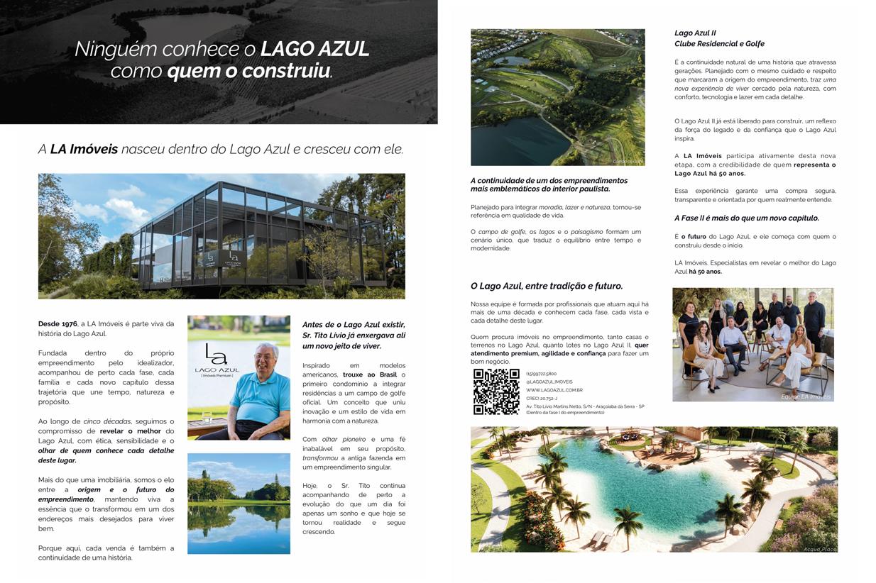 Nesta edição inaugural, nossa matéria de capa “O legado de um sonho” resgata a origem do Lago Azul e a visão pioneira de Tito Lívio Martins Netto, cujo sonho inovador de unir campo de golfe, natureza e moradia de alto padrão deu origem a um empreendimento que completa 50 anos mantendo sua essência, valorizando o ambiente e consolidando-se como referência de qualidade de vida. Celebrar este marco significa reconhecer a força de um projeto que não apenas se tornou realidade, mas que continua inspirando gerações.