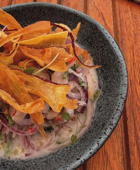 Logo na chegada, fomos recebidos pelo Matheus, cuja hospitalidade já antecipa o que está por vir. O restaurante carrega o DNA de uma cozinha afetiva conduzida por uma família que entende comida como herança e continuidade. A mãe, chef com mais de 30 anos de experiência, é a guardiã dos sabores e da memória. A filha mais velha, Gabi Tropicana, é Embaixadora da Gastronomia do Cerrado Mineiro e a chef executiva da casa e também assina o bar. Ela apresenta menus que mudam duas vezes ao ano, sendo o atual uma homenagem à comida tropeira. Estive no Riacho Pequeno por dois dias.No primeiro,começamos pelo ceviche, um dos pratos mais marcantes da experiência. Feito com peixe de rio, leite de coco, limão-cravo, pimenta-decheiro, cebola roxa, azeite de coentro, gengibre, milho crocante e chips de raízes, é fresco, equilibrado e surpreendente. Também experimentamos o Paulistânia, um tartare de carne serenada com coalhada da casa, picles de maxixe e telha de polvilho. Entre os principais, o Memória Tropeira se destacou com costelinha suína glaceada ao molho de rapadura, canjiquinha ao próprio molho, caviar de quiabo e couve tostada na manteiga. As caipirinhas clássicas da casa, Eterna Inezita, Jabuticana e