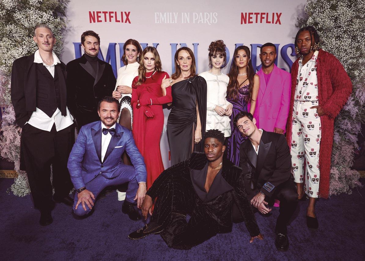 Bruno Gouery, Lucas Bravo, William Abadie, Kate Walsh, Camille Razat, Philippine Leroy-Beaulieu, Samuel Arnold, Lily Collins, Ashley Park, Paul Forman, Lucien Laviscount y Jeremy O. Harris asisten a la alfombra roja de Emily en París en el consulado francés, Diciembre 2022, Nueva York. Foto: Jamie McCarthy / Colección Getty Images Entertainment / Getty Images