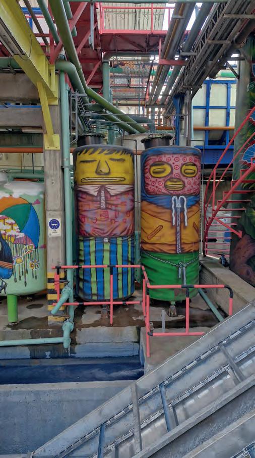 De acordo com Ernesto Neto, a matéria-prima utilizada foi o algodão e materiais reciclados, como tampinhas de garrafa PET, o que enfatiza também a busca contínua pela sustentabilidade. “Trabalhamos com crochê, utilizando algodão como material base. A serpente, por exemplo, possui elementos simbólicos muito fortes. As cores da obra foram obtidas por meio de tingimentos naturais, como chá preto para o tom bege, e jatobá e casca de cebola para o marrom. Esses métodos nos conectam à energia da Terra, oferecendo uma experiência sensorial mais rica em comparação aos tingimentos