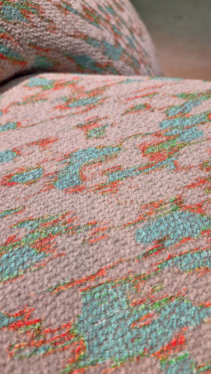Na Heimtextil 2025, Patricia criou grandes sofás, poltronas, instalações artísticas e painéis feitos de resíduos têxteis, de produtos descartados e com inovação e tecnológica. A designer espanhola utiliza tecnologia avançada pra desenvolver novas texturas, com as que parecem emborrachadas, sensíveis ao toque, macias e resistentes, painéis de linhas, costuras macramê e bordados, e uma técnica de pintura sobre o tecido muito incrível e bela, todas à base d’água.
