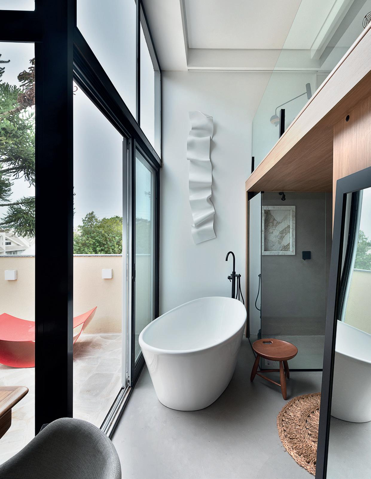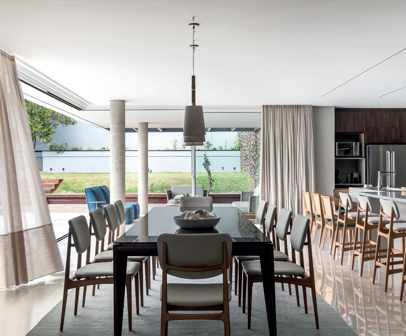 claro, madeiras e nuances da natureza do local, como o verde da mata e o azul da água, os profissionais busca ram harmonizar a atmosfera dos ambientes internos com o entorno. Além disso, o uso de porcelanatos e couro ecológi cos, pedras escovadas, textu ras rústicas e tecidos naturais traduz o conceito estético atual e sofisticado escolhido para os espaços.