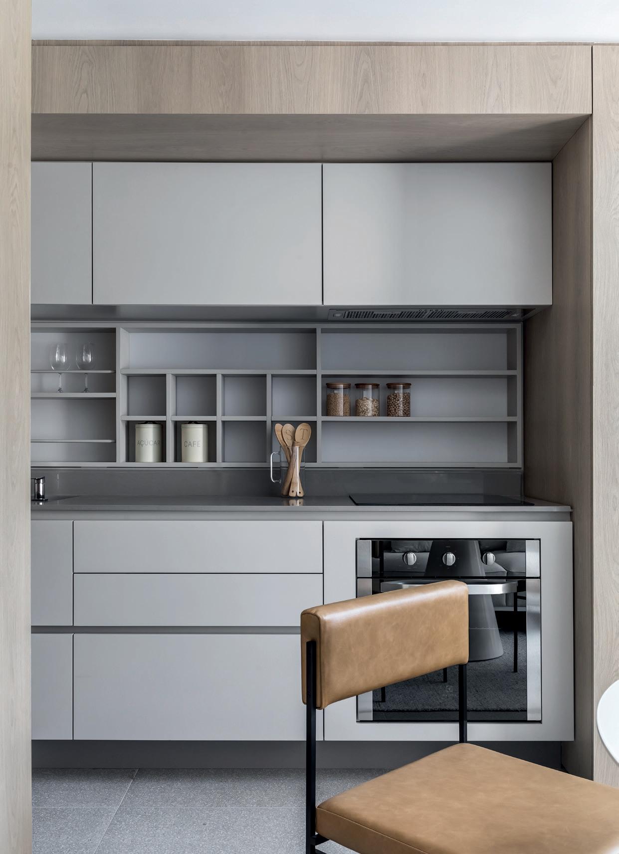 contemporâneo e minimalis ta, o décor conta com uma paleta de tons neutros com toques de cor nas obras de artes. O uso de madeira clara tem como objetivo ampliar a sensação de aconchego, contrastando com a força do cinza e tornando a lingua gem dos espaços singular e atemporal.