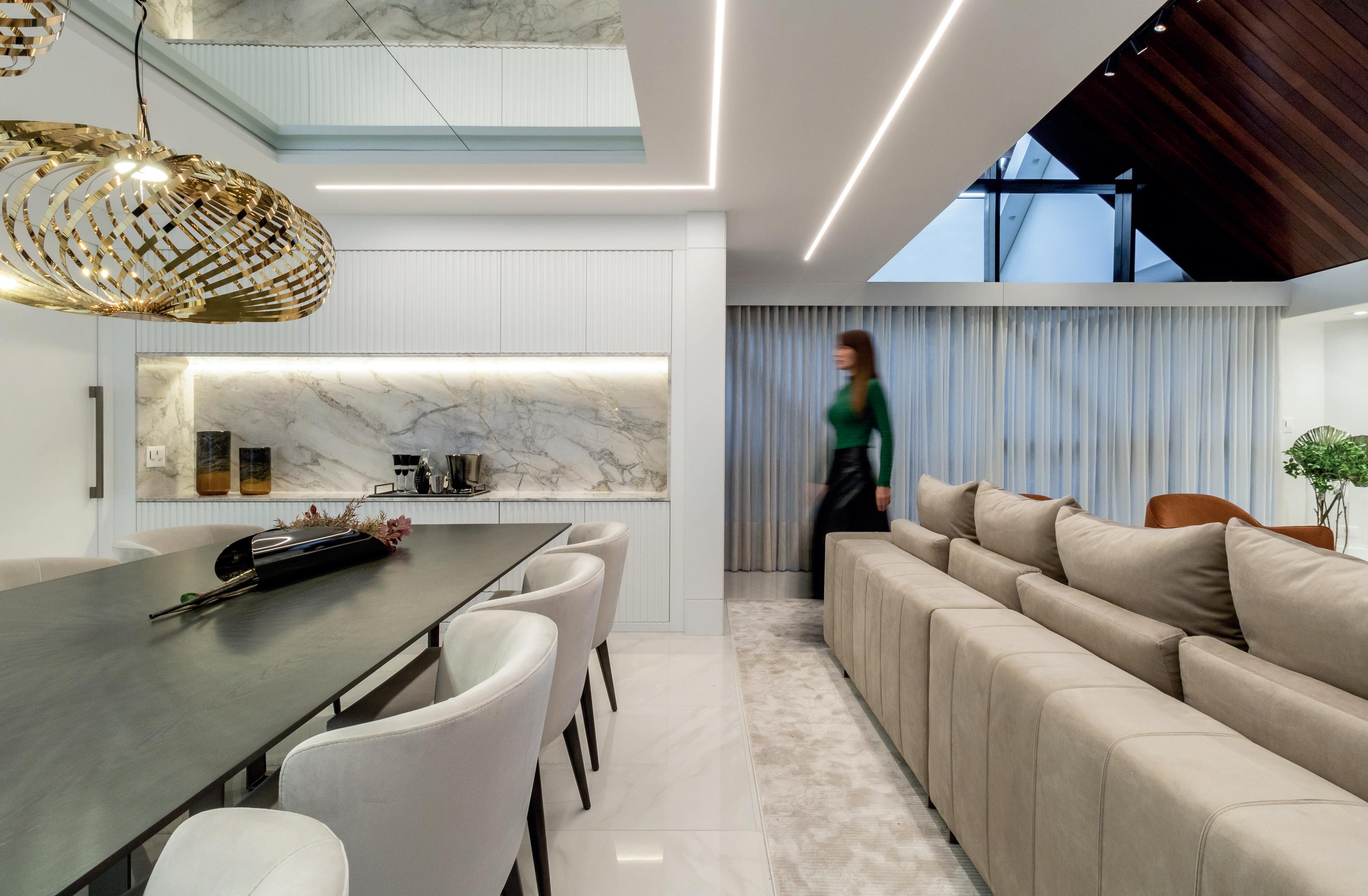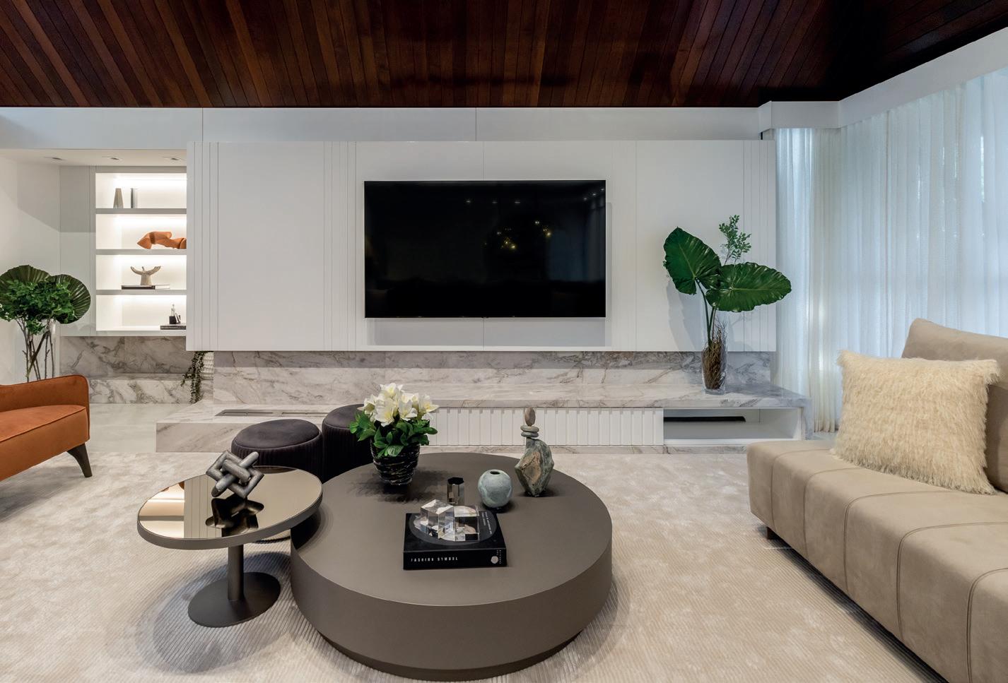 Na área social, o destaque fica por conta do painel em Mármo re Branco Paraná utilizado como painel da televisão e da obra de arte em azul, que funciona como ponto de cor, trazendo personali dade ao espaço. Já para o projeto luminotécnico, os profissionais apostaram no uso de uma ilumi nação indireta com temperatura de luz morna.