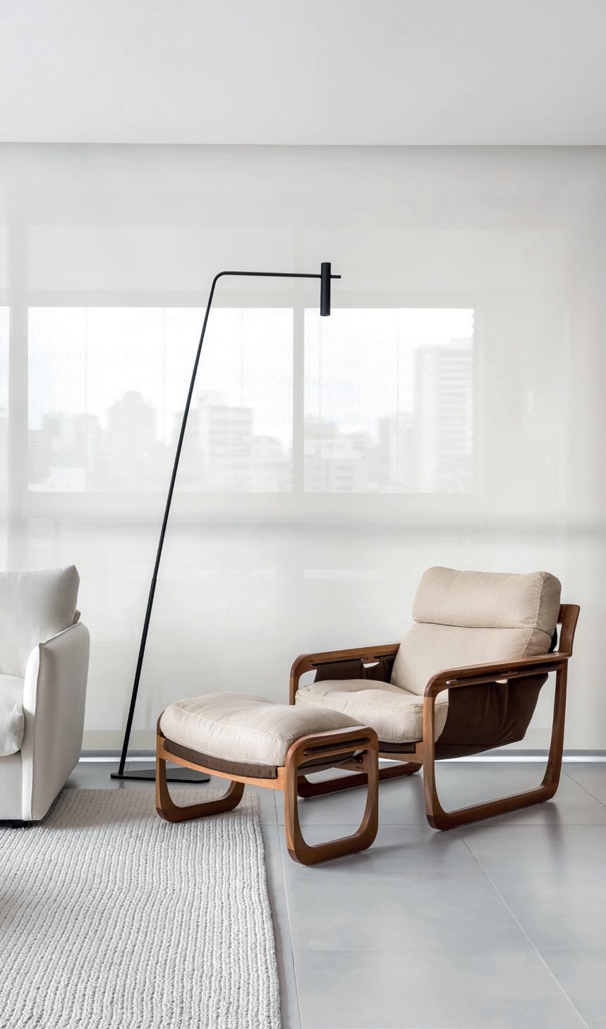 O uso de elementos como o couro, a lona e os tecidos com tons mais arrojados traz referências sofisticadas à decoração, tanto no living quanto no quarto. Já na saca da, a porta permite a unifi cação entre a área externa e social, ampliando os espaços de convívio.