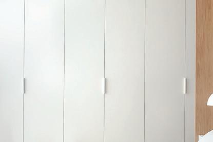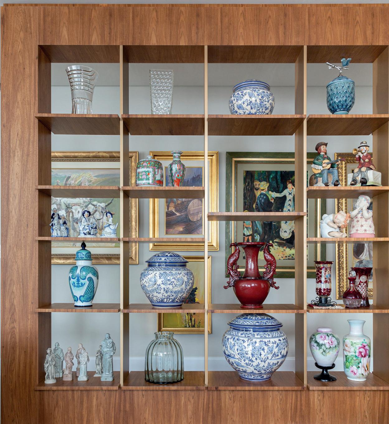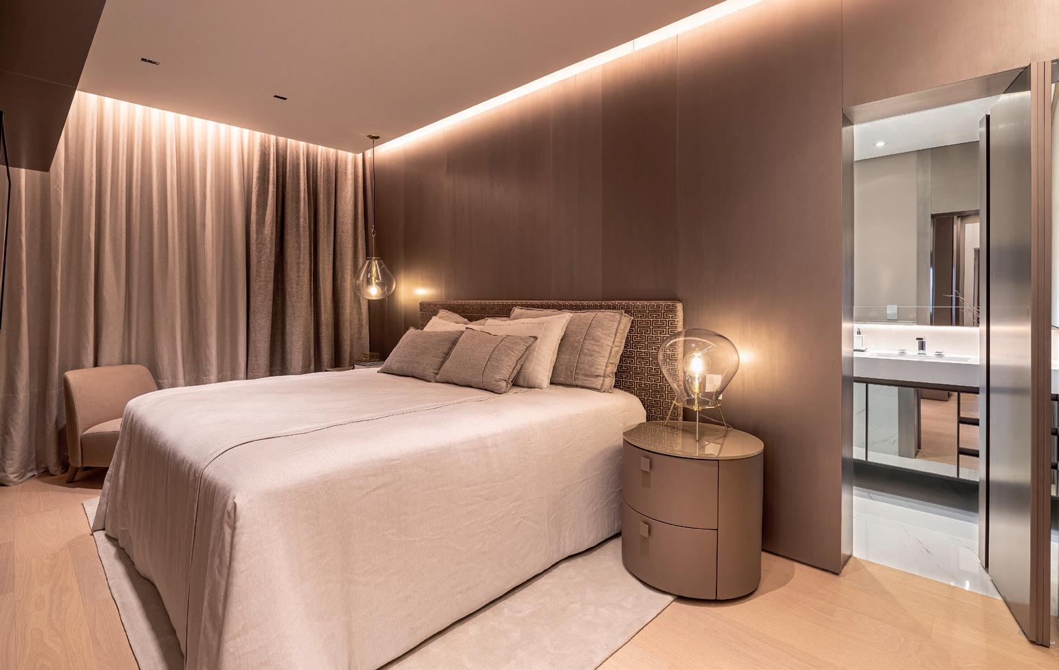 espaços, permitindo uma melhor circulação no interior do aparta mento. Com detalhes surpreen dentes, como o acesso discreto através das portas em muxarabi ao closet e ao banheiro e o uso de alguns elementos como a geladeira embutida no armário, o projeto ganha forma com muita elegância.