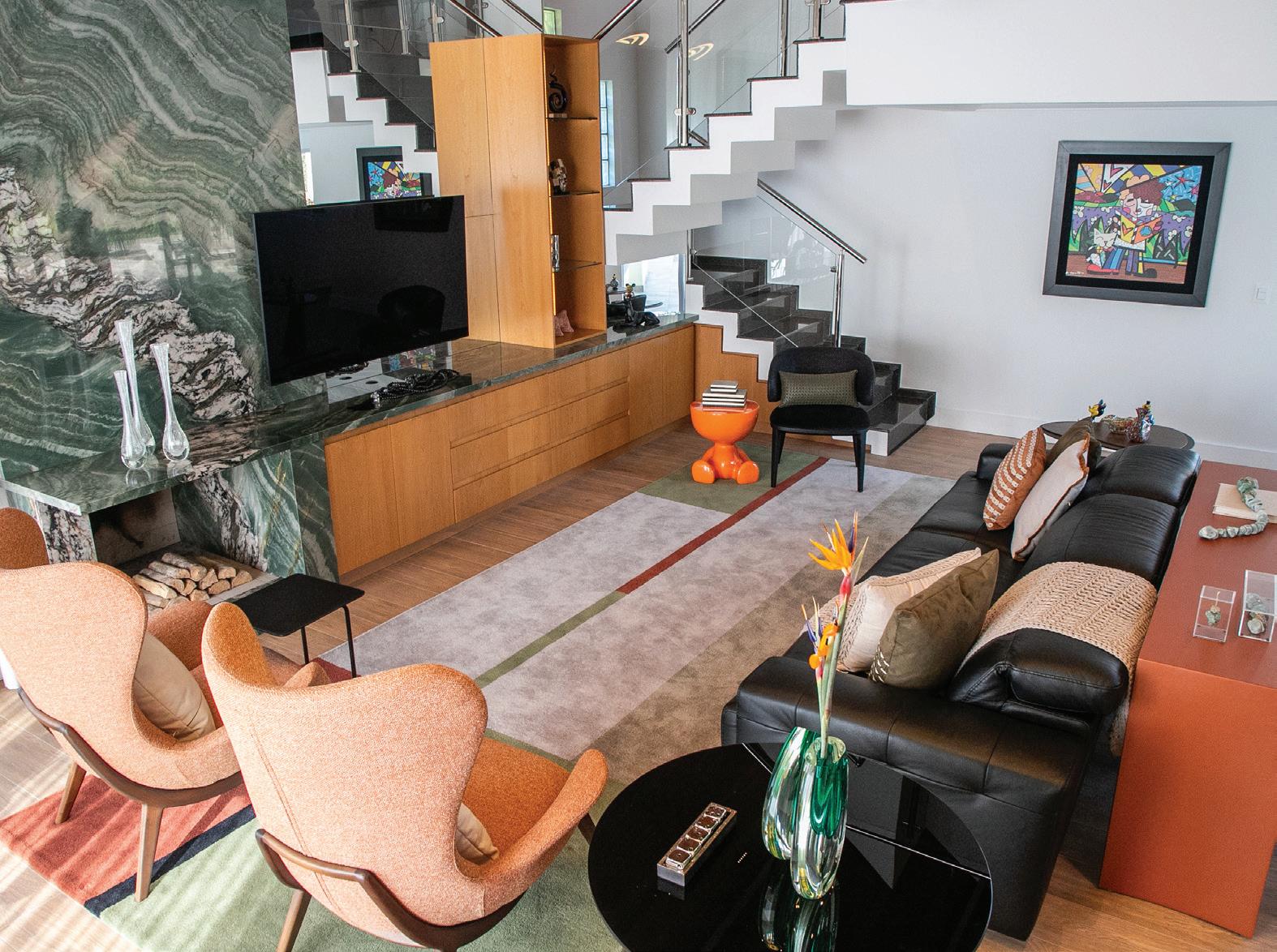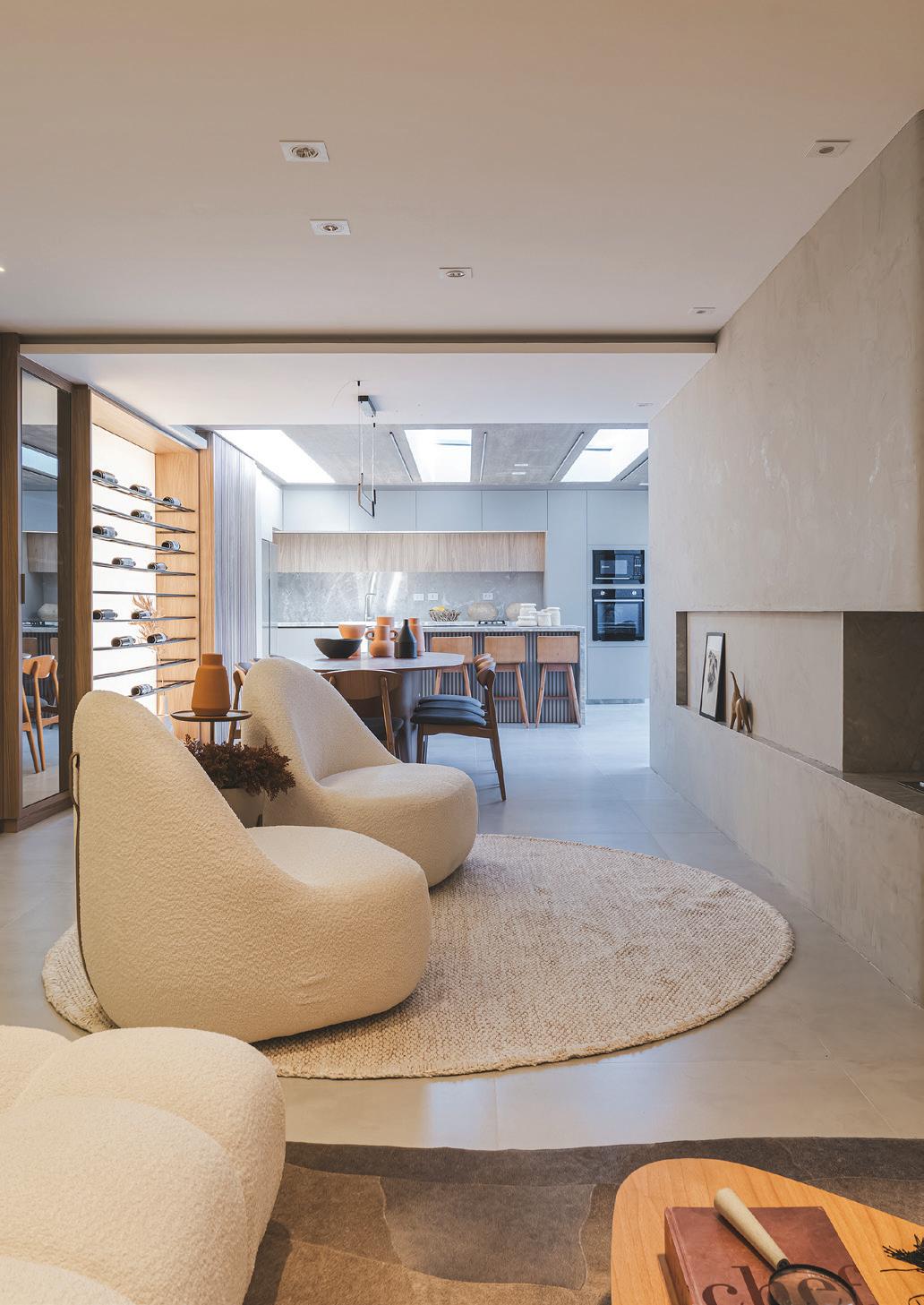 A INTEGRAÇÃO DE espaços neste projeto é uma dança de cores, texturas e iluminação. Cada ambiente se conecta harmoniosamente, preservando sua identidade e criando uma casa que pode ser tanto um refúgio tranquilo para momentos íntimos quanto um centro vibrante para celebrações.