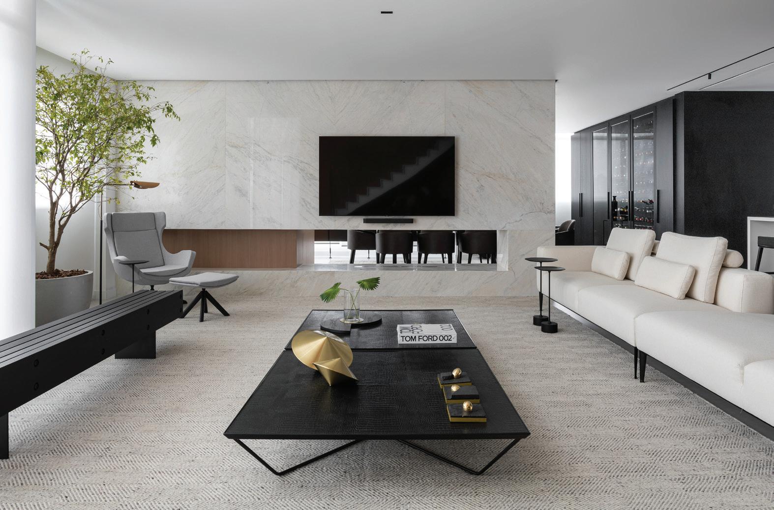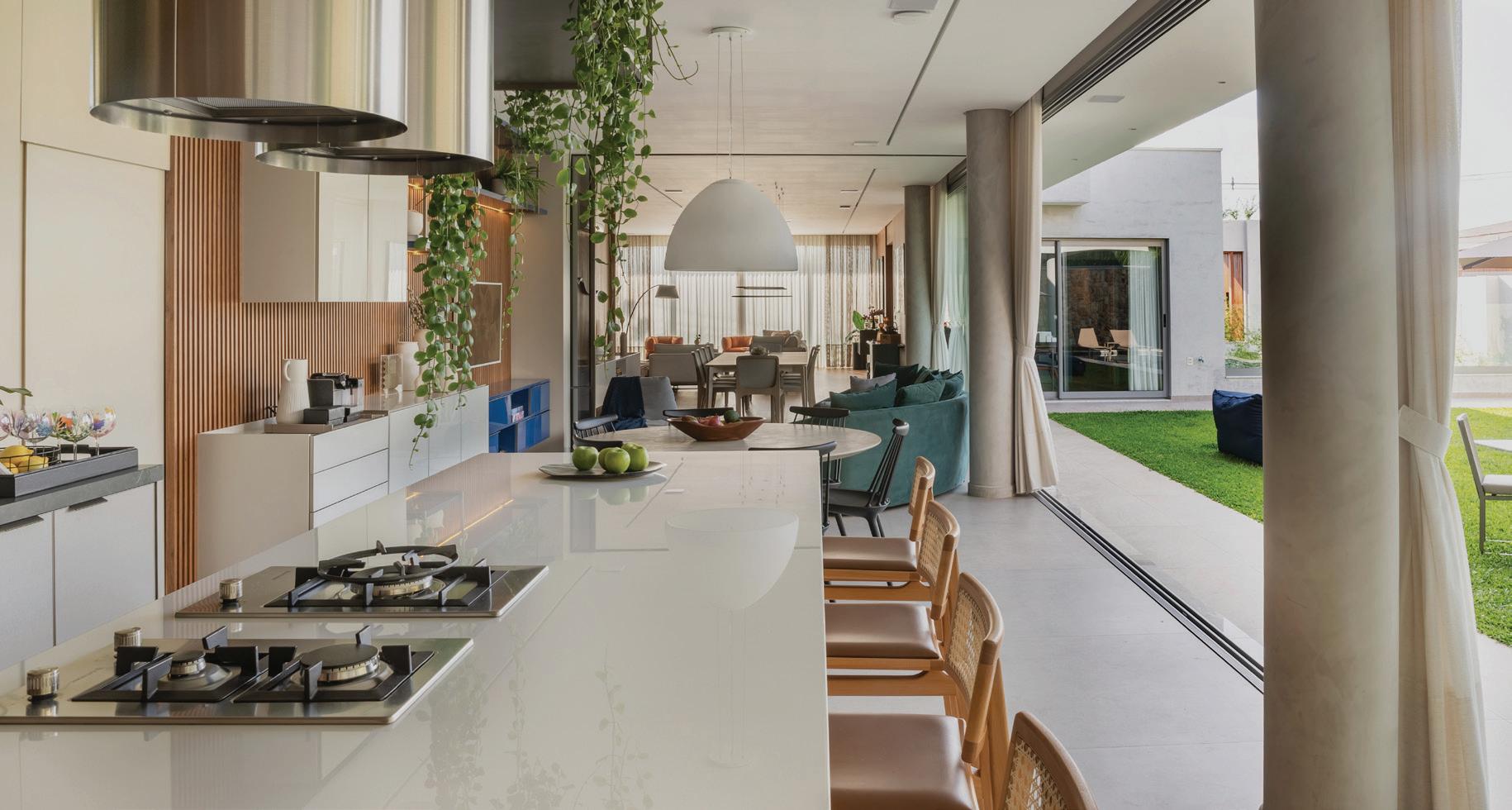 completa abrange cerca de 200 m², sendo destes, quase um terço reservado para a sala integrada. Os destaques do projeto incluem uma adega estrategicamente posicionada para ocultar um pilar estrutural, dividindo de forma transparente a área gourmet e a sala de jantar. O uso do vidro favorece a integração visual e permite que a luz do sol flua entre os ambientes. O forro com iluminação indireta cria uma sensação de pé-direito mais alto do