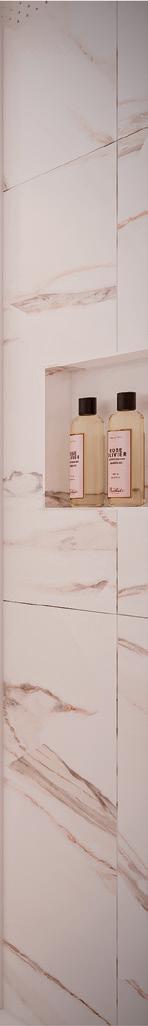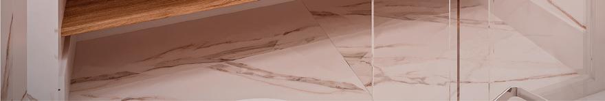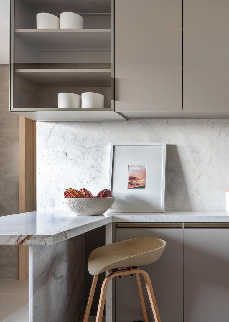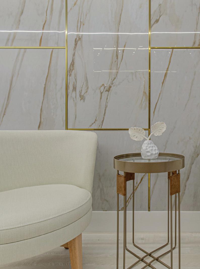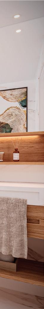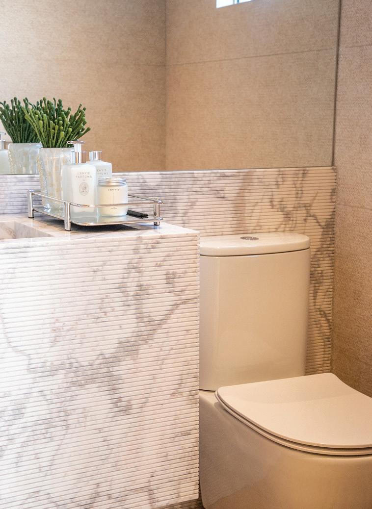 Entre os materiais e elementos destacados, estão os mármores Grigio Michelangelo e Branco PR Nuvolato, lâminas de madeira e detalhes em tons dourados foscos, que conferem sofisticação e elegância ao espaço.