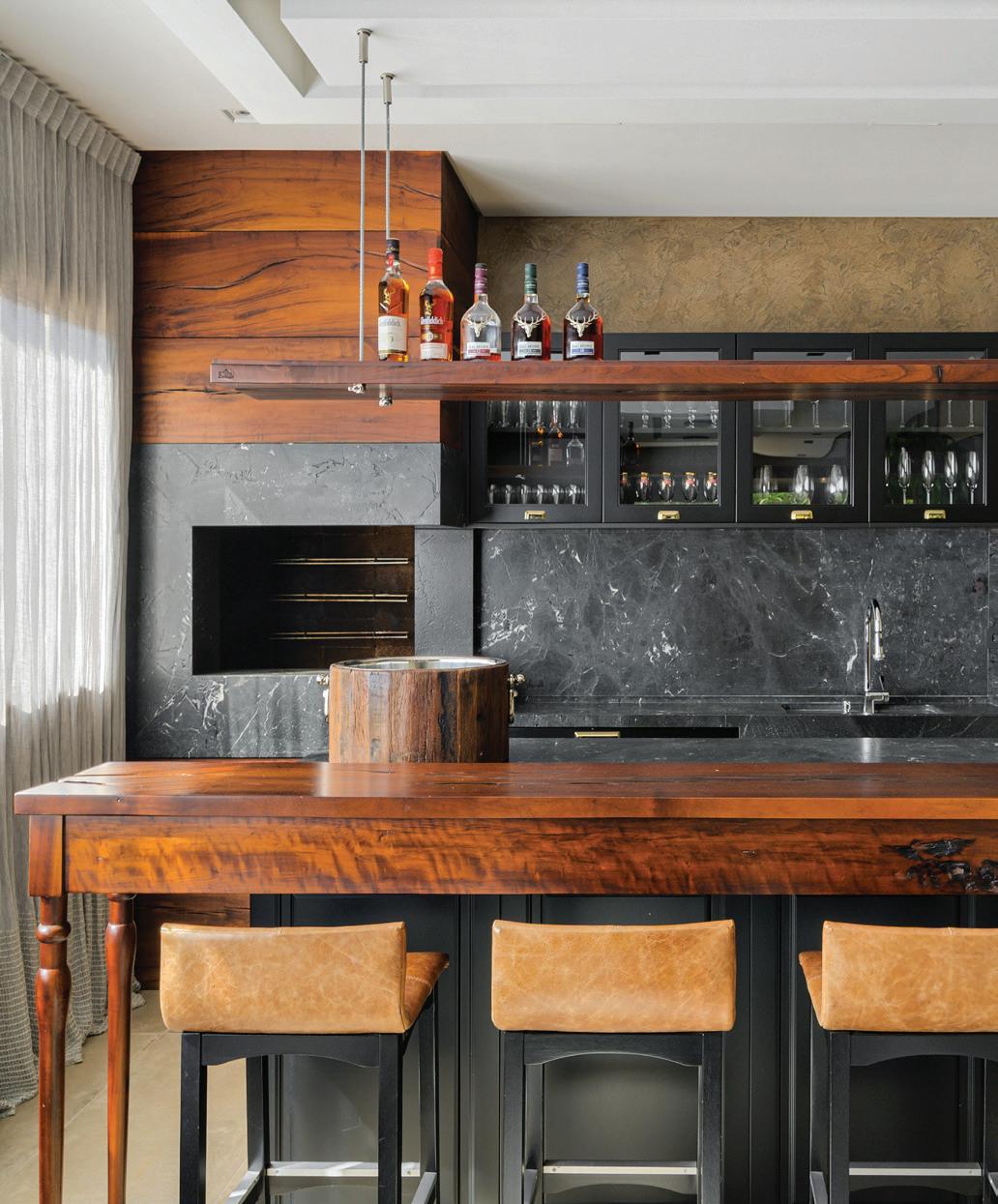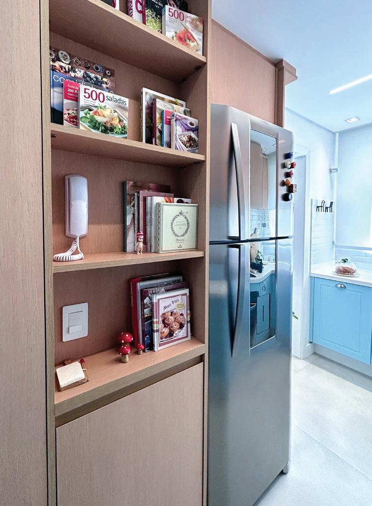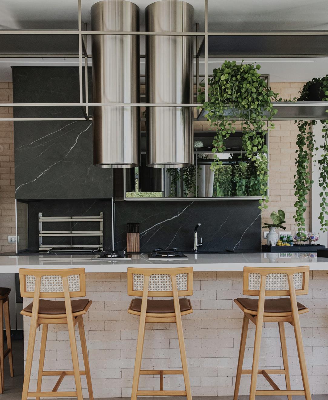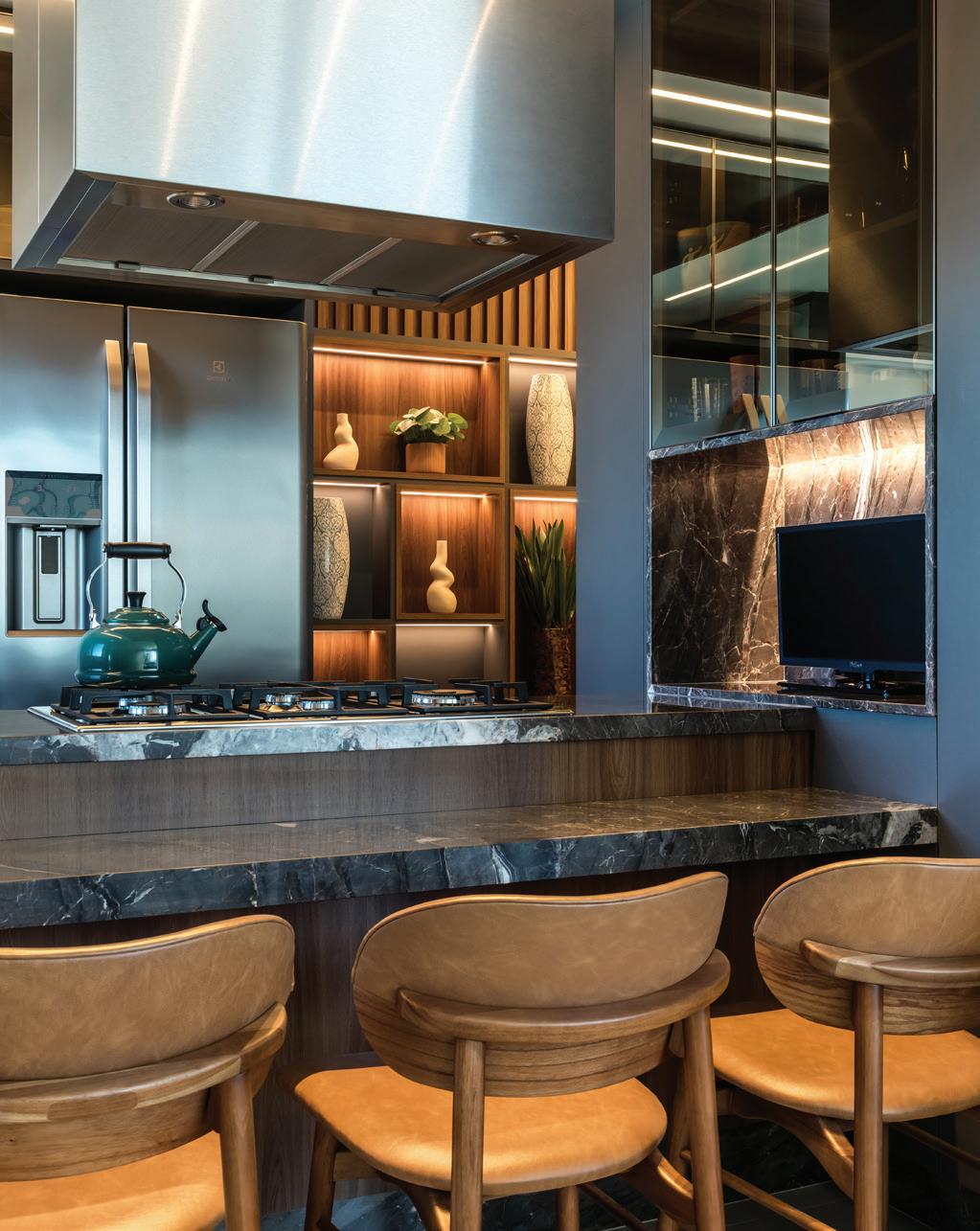 que o espaço real permite. As faixas de espelho também expandem o espaço e a ilha com bancada de apoio proporciona praticidade para encontros informais e refeições rápidas. Um detalhe único é o ripado vazado, que facilita a comunicação visual entre a área gourmet e a despensa, mantendo a privacidade necessária.