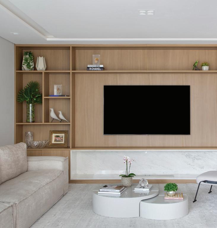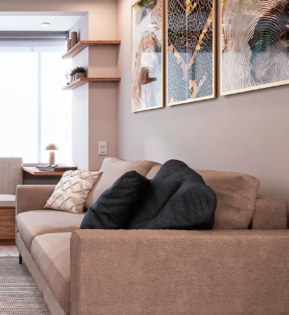 4. As cores claras predominam na sala de estar, destacando os detalhes terrosos que irão se intensificar nos ambientes seguintes.