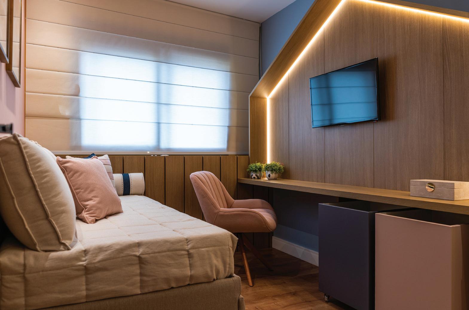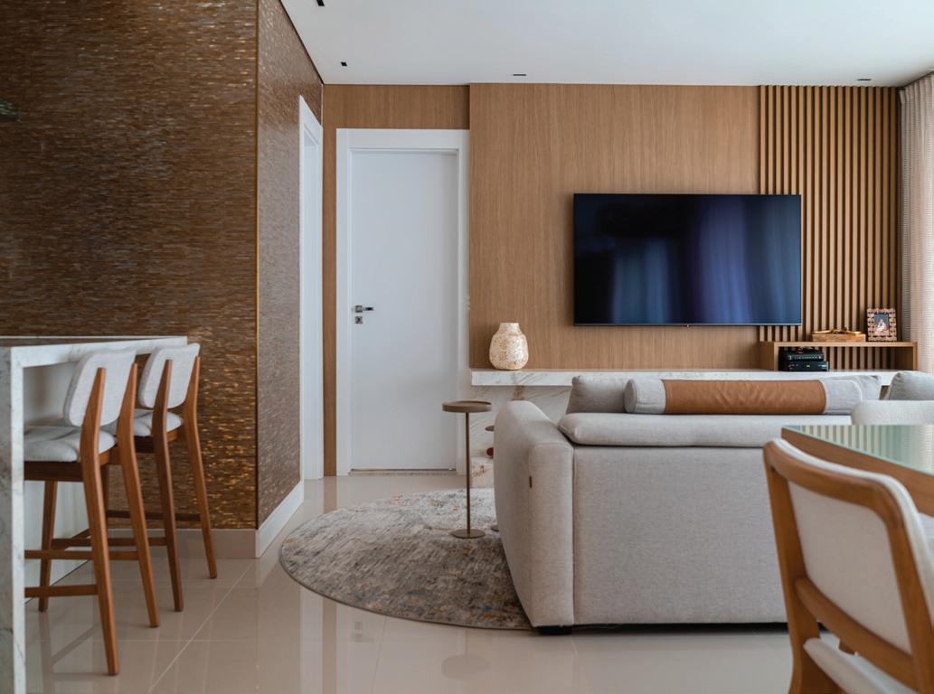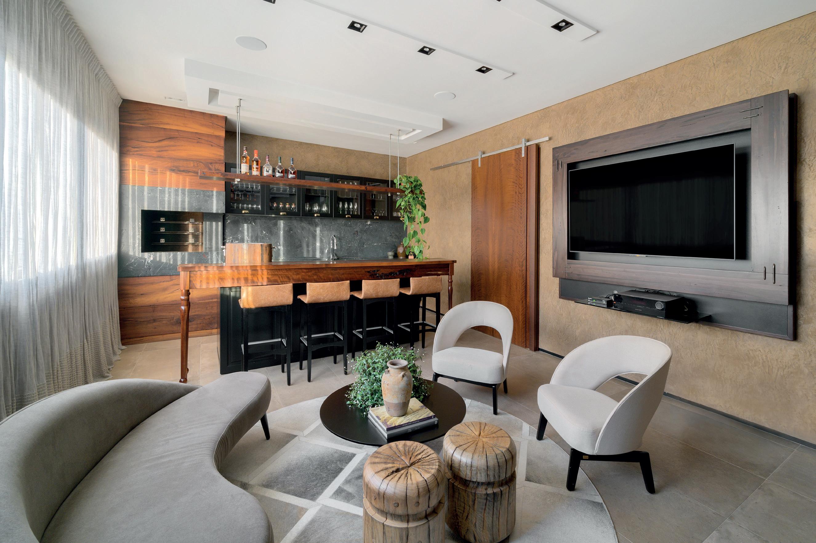 O projeto ainda inclui materiais de alta qualidade, como mobiliário sob medida, executado pela Marcenaria