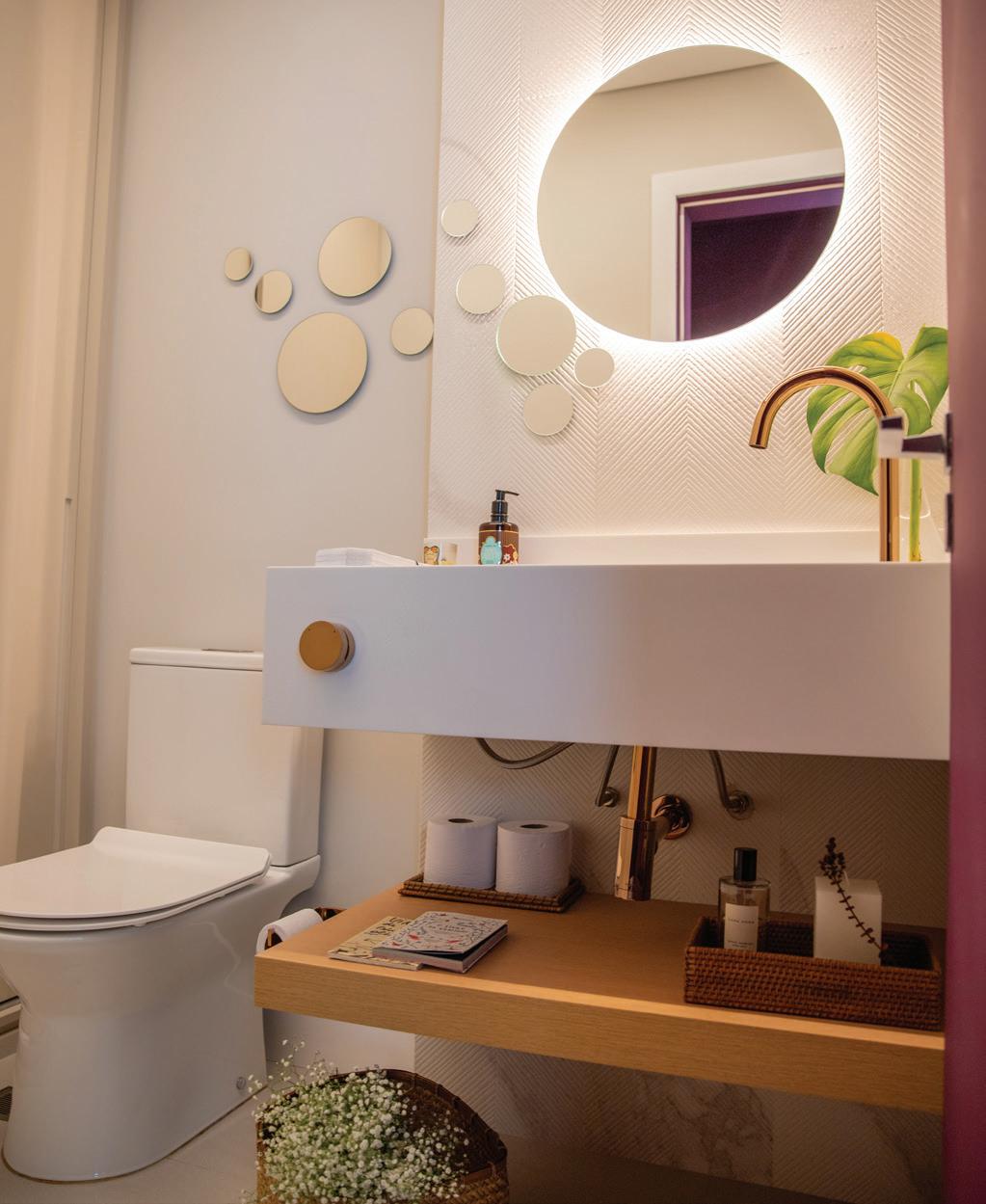7. No lavabo, a iluminação indireta do espelho realça a bancada em Mármore Paraná e os acessórios em dourado.