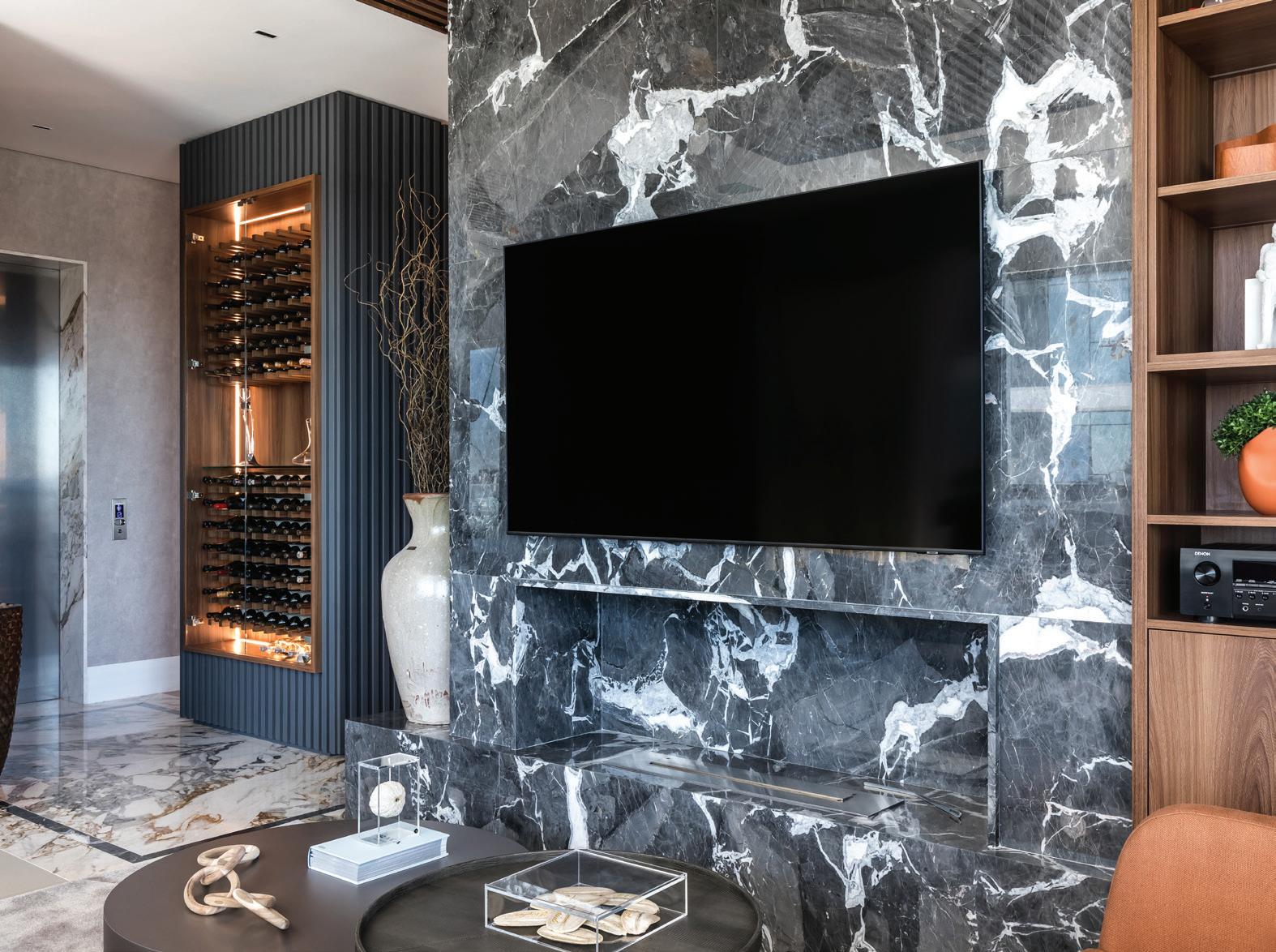 4. Adega em marcenaria ripada sobre o mármore é um charme logo na entrada do apartamento.