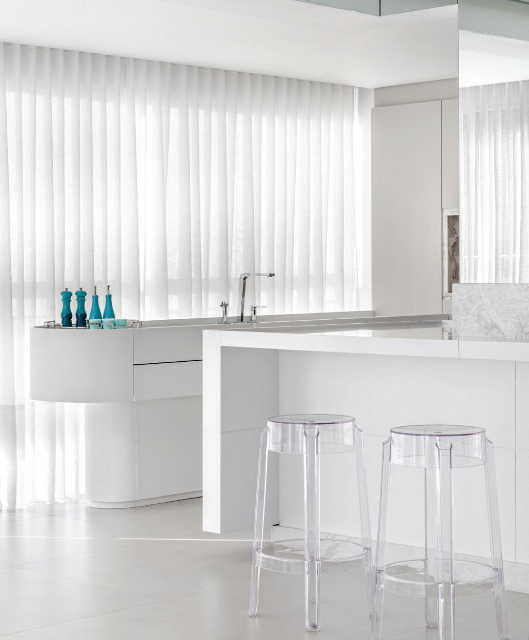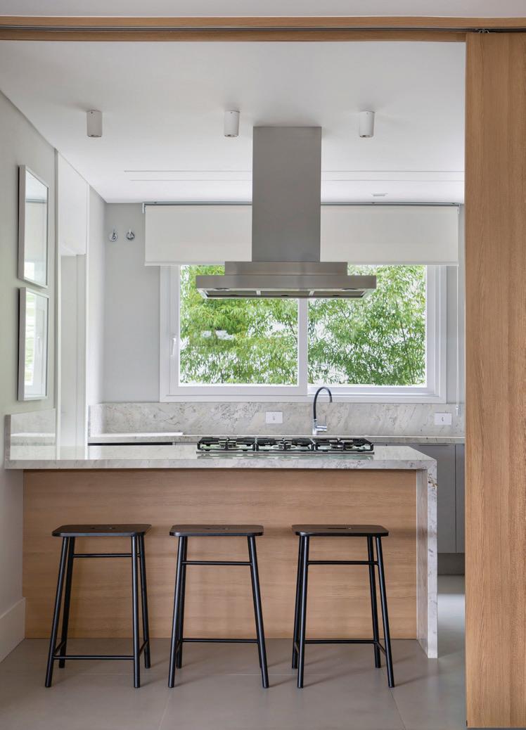 O desafio da arquiteta foi integrar os espaços de forma homogênea, mantendo o mesmo pé-direito em toda a área integrada para unificar os ambientes.