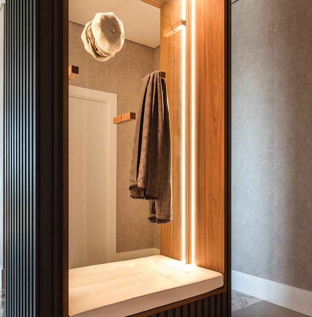 2. No hall de entrada, as cores claras são realçadas pelos perfis de LED embutidos e nichos espelhados.