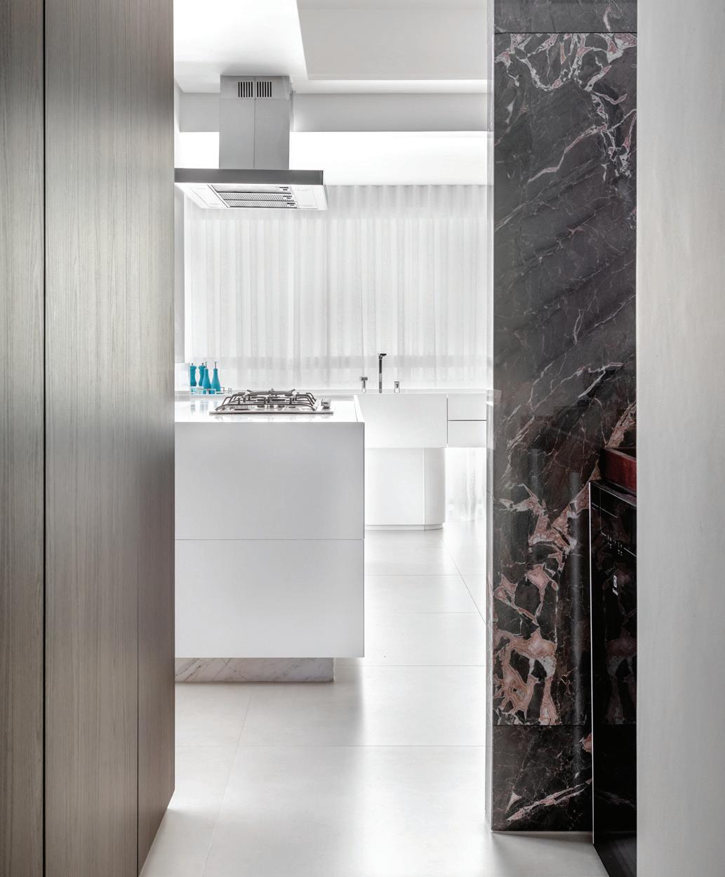A iluminação foi estratégica, com perfis para intensidade de luz e pontos suaves, para criar uma atmosfera acolhedora. Os materiais são outro destaque do projeto, como o mármore branco Paraná
