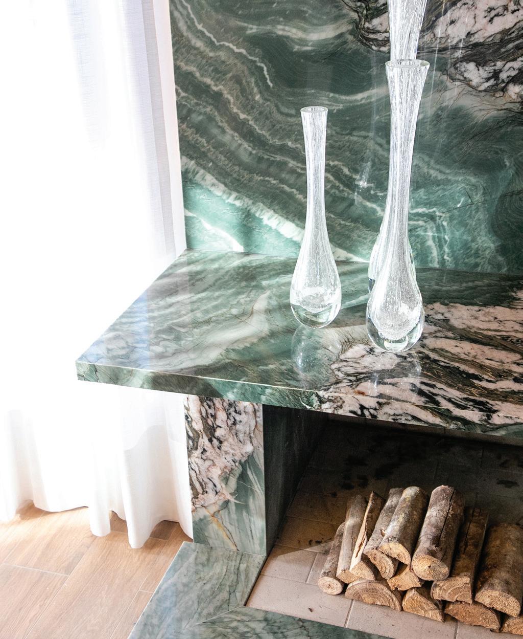 Móveis In Casa, a lareira, o nicho do buffet e a bancada do lavabo em Mármore Paraná, a bancada