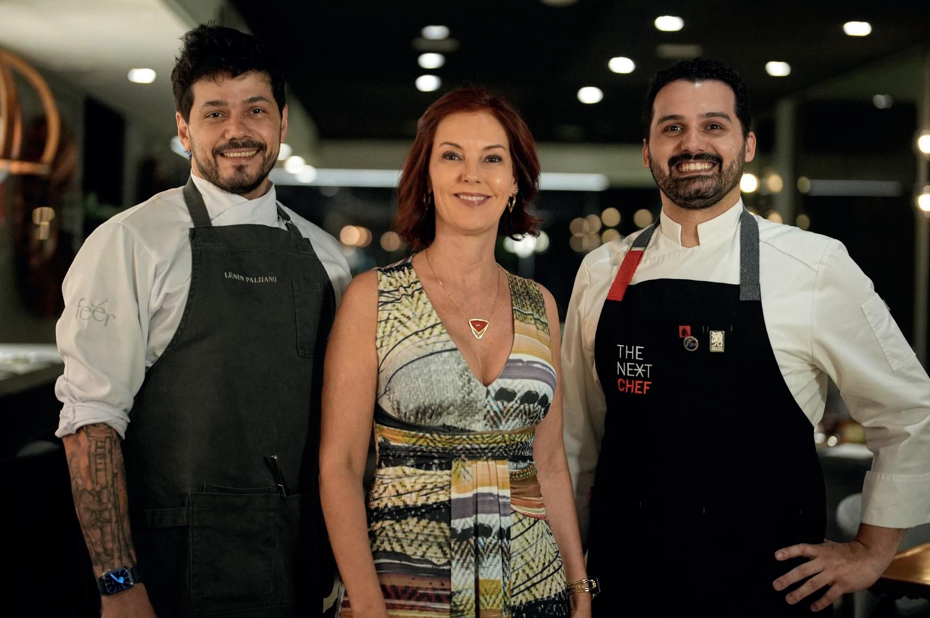 Os chefs Lênin Palhano, do Restaurante Feér, e Lucas Coelho, do Hai Yo, com Heloise Merolli, proprietária da Vinícola Legado.