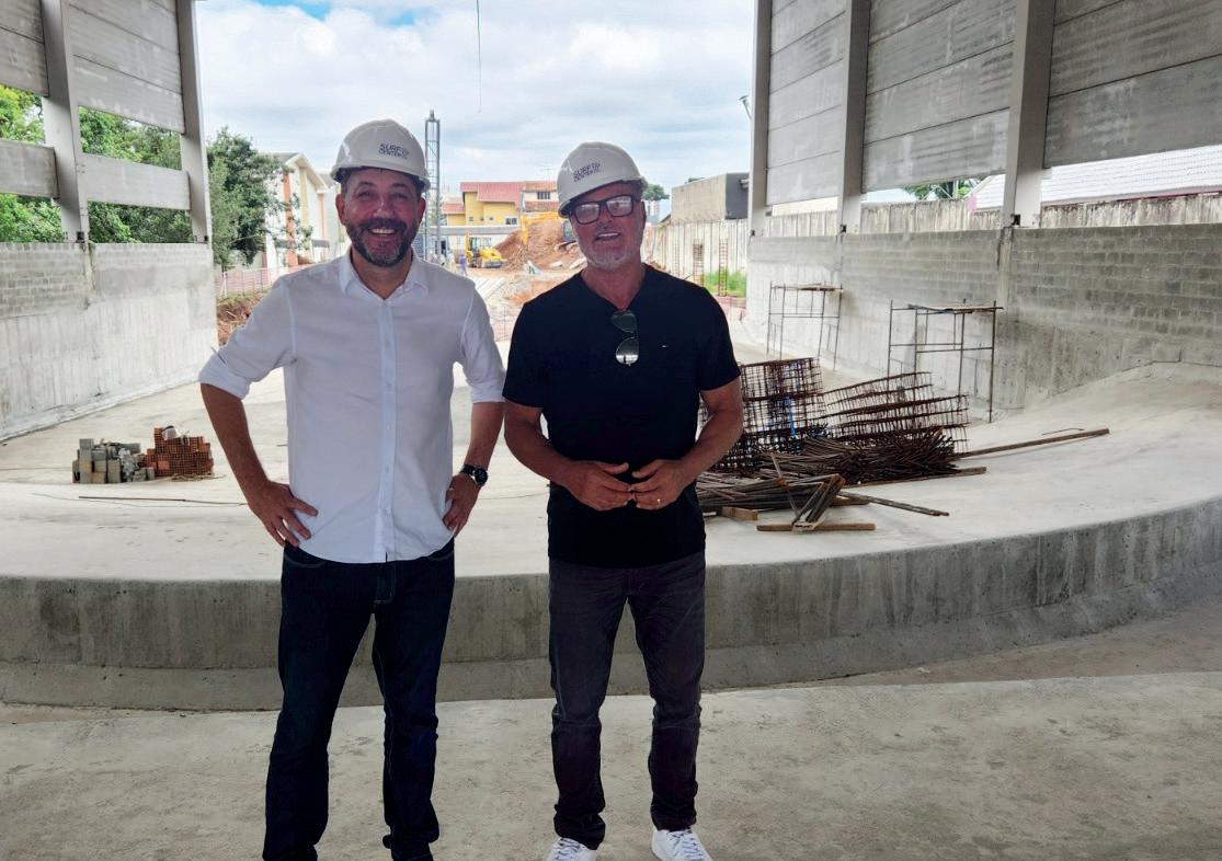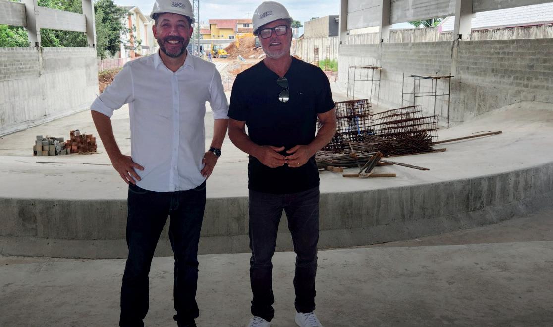 O ator Kadu Moliterno (à direita) aproveitou sua passagem por Curitiba para conhecer o Surf Center, primeiro clube esportivo com piscina de surf, que será inaugurado na capital paranaense no final deste ano. Além de visitar a obra, ele conheceu o protótipo que simula o funcionamento da piscina de ondas. Kadu, que é surfista, ficou muito conhecido como Juba, personagem da série Armação Ilimitada , que fez sucesso nos anos 1980.