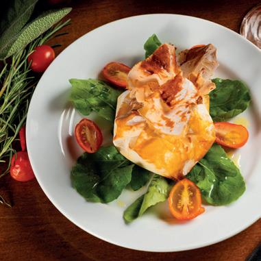 (Opção 2) Crispy Italiano (crispy de presunto italiano com creme de queijo emmental. Acompanha mix de folhas verdes e roxas, temperadas com vinagre francês