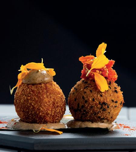 (Opção 1) Arancini de Abóbora com Carne-seca (bolinho de risoto com queijo parmesão, carne-seca e abóbora).