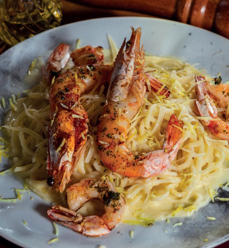 (Opção 3) Espaguete Limone com Camarões (massa fresca de grano duro e ovos, molho à base de nata fresca, parmesão, camarões, toque de limão-siciliano e camarões grelhados).