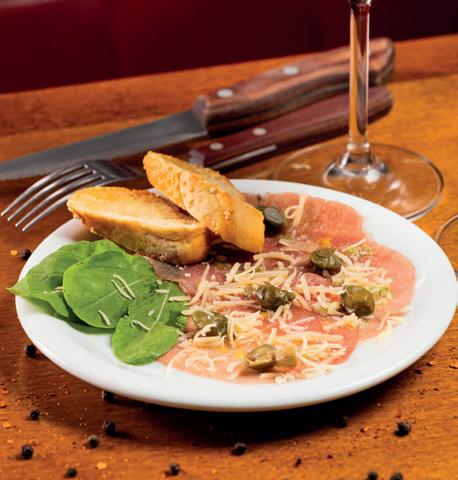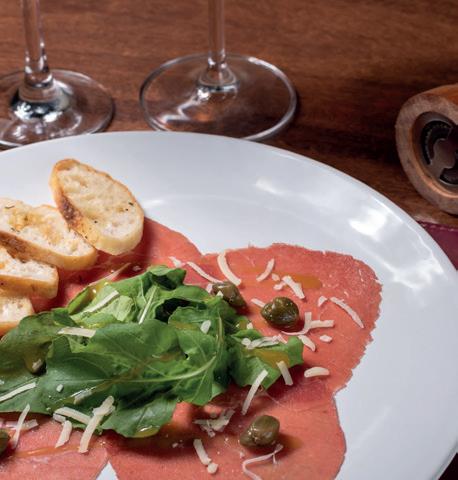 (Opção 2) Carpaccio de Haddock (carpaccio de haddock defumado, alcaparras, pimenta rosa, azeite de oliva, ervas frescas, pão italiano e rúcula).