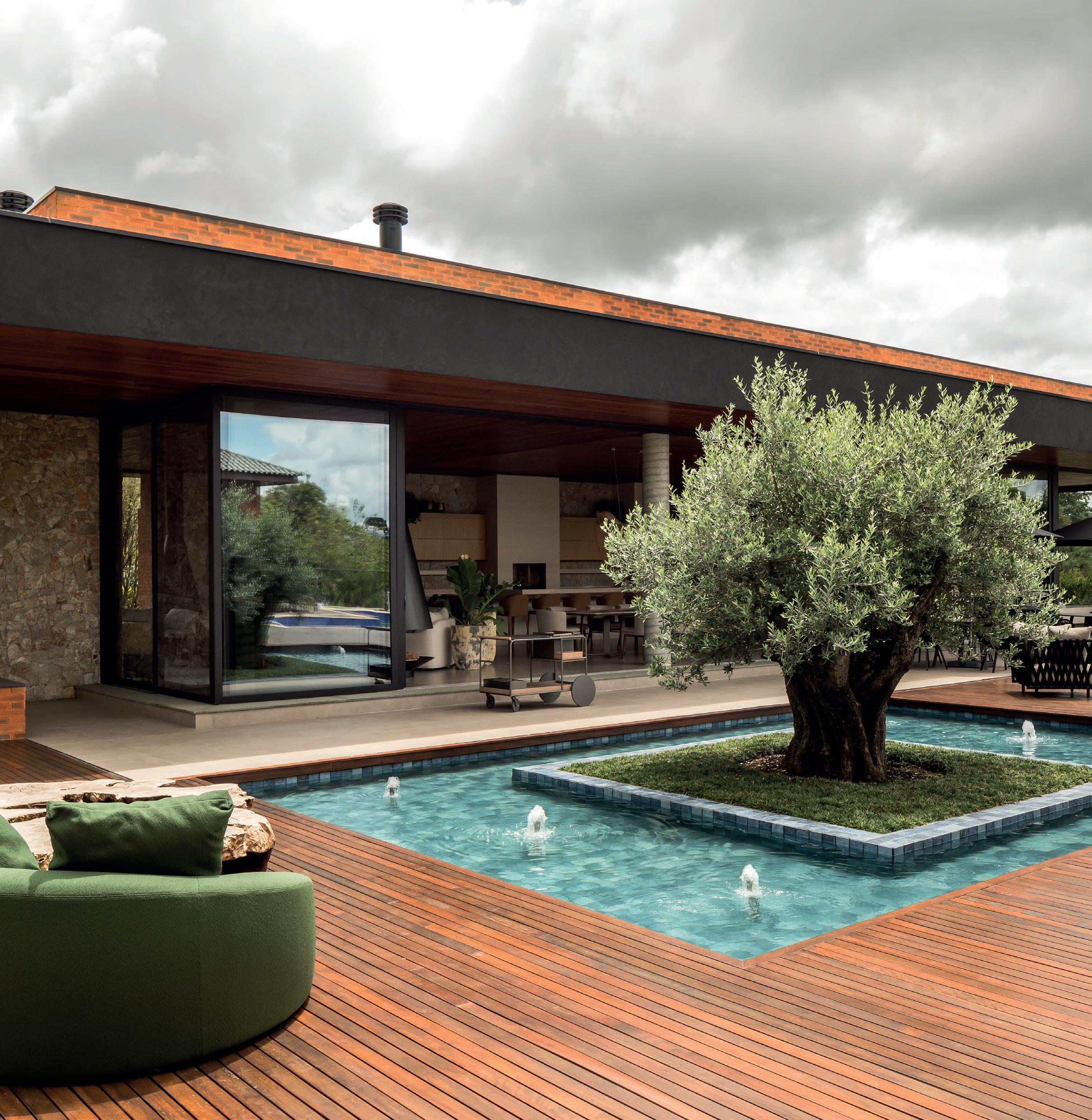COM VOLUMETRIA MARCANTE e planta em “U”, esta casa térrea contemporânea no Alphaville Graciosa foi implantada no ponto mais alto do terreno em aclive para garantir privacidade, insolação e vistas privilegiadas. Os ambientes sociais — estar, jantar, lareira, cozinha e gourmet — são totalmente integrados entre si e com a área externa, na qual a piscina suspensa e o bosque ao fundo compõem um cenário de contemplação. Com 600 m², a residência foi pensada para um casal jovem com três filhos adolescentes e aposta em uma arquite-