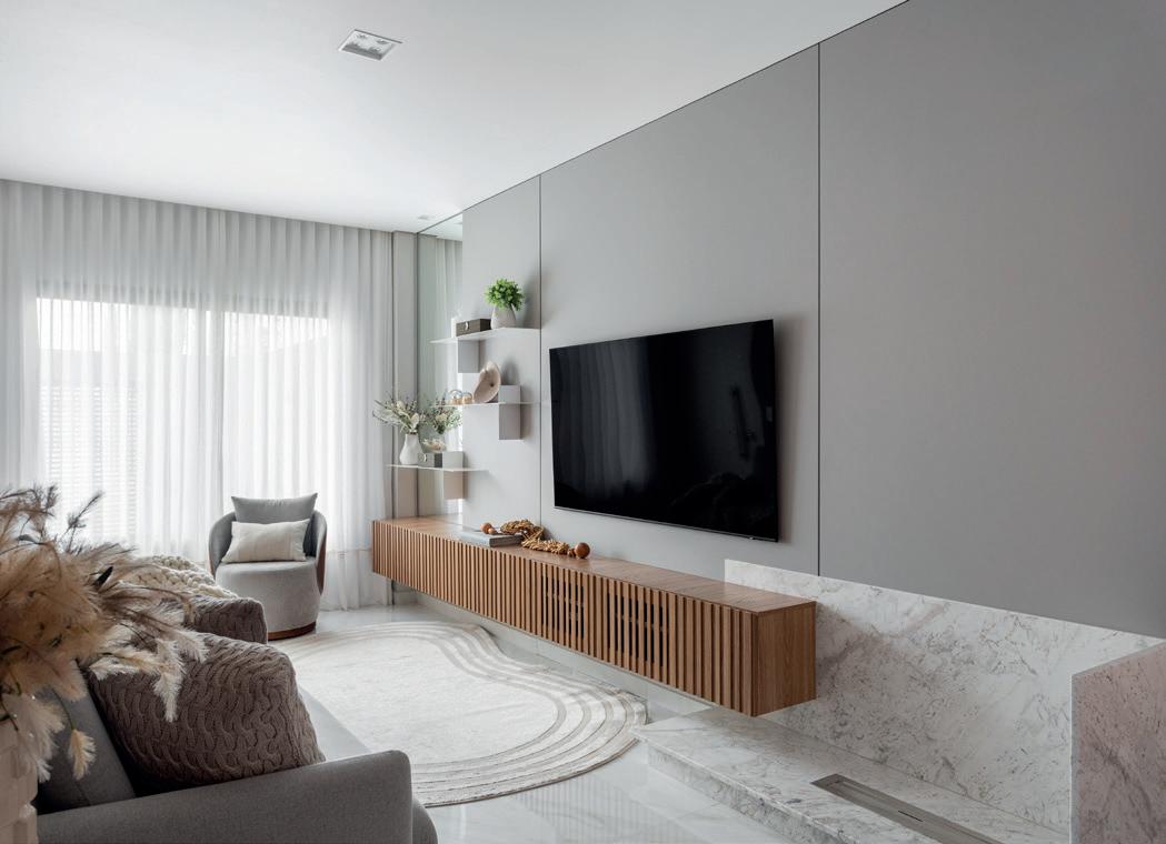 tura sofisticada, com sobreposição de telhados, beirais largos e contrastes de materiais como pedra moledo, madeira natural e amplas aberturas em vidro. A proposta monocromática em tons terrosos ganha intensidade nos detalhes em bronze, nas texturas e nas esquadrias. A varanda com pé-direito duplo é o coração do projeto. Conectada à área de lazer e com vista para o bosque, abriga uma lareira que convida ao convívio. A iluminação quente e indireta reforça o clima acolhedor, valorizando volumes e superfícies com elegância e leveza.