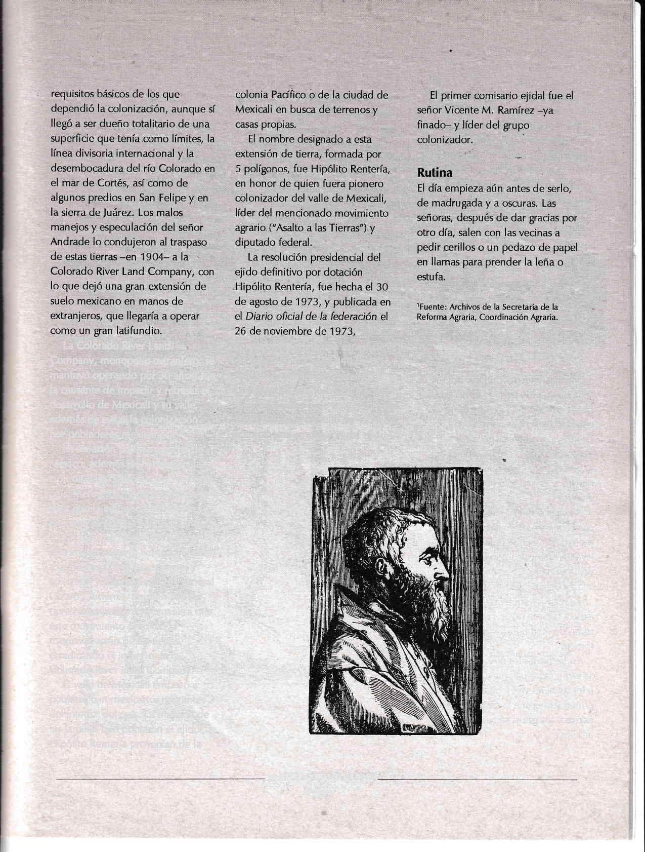 No fue sino hasta 1937 que el movimiento agrario llamado "Asalto a las Tierras", con bases firmes y concretas y bajo el puño del general Líuaro Cárdenas, terminó con la opresión extranjera, de manera que este movimiento permitió la mexicanización de las tierras, erradicando el imperio de la Colorado River Land Company. El valle de Mexicali empezó a pob,larse con mexicanos migrantes del interior dei país. La mayoría de las familias que poblaron el ejido Hipólito RenterÍa provenían de la