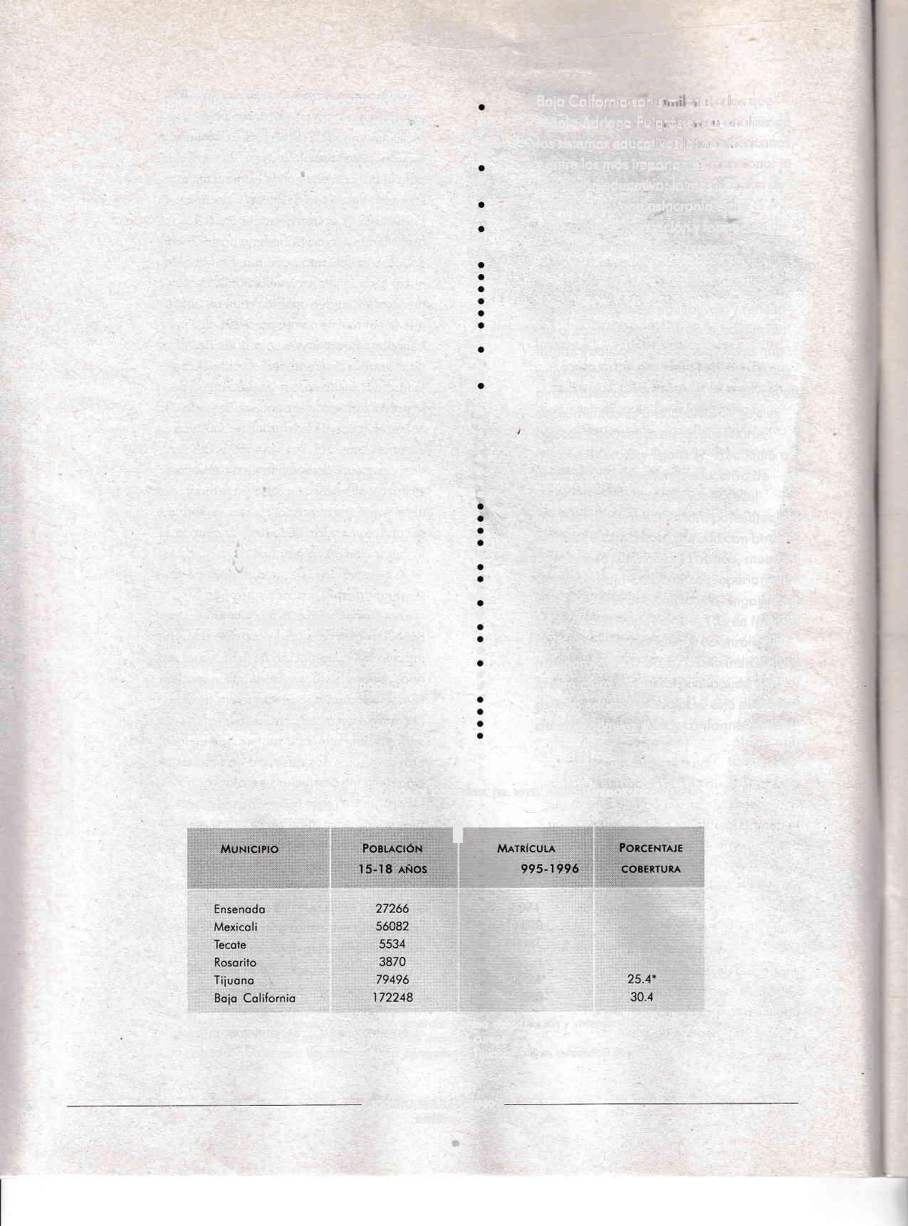 escolorizodo (l 5- I B Años) lo estén demondondo tombién. Actuo lmente, el sistemo escolorizodo en{rento uno fuerte presión por porte de lo demondo, no sólo en lo zono metropolitono de lo ciudod de México, sino tombién empiezo o serlo en Boio Colifornio. Poreiemplo, uno noto periodístico publicodo por el diorio E/ mexicono, del 3 de obril de .l998, señolo que es lodo uno "odiseo poro olconzor uno ficho en el Colegio de Bochilleres de Boio Colifornio,Coboch", y porticulormente se refiere ol plontel Mexicoli l, en el que los podres de lomilio tienen que hocerfilo y posor lo noche desde un dío ontes del periodo de entrego de fichos. Esto ho provocodo que lo institución busque recursos odicionoles poro omplior su infroestructuro en los próximos oños (Gorcío Rivos, 1998). Ademós, los bochil lerotos tecnológicos dependientes de lo SE11, y tombién el Coboch, estón intentqndo poneren morcho uno modolidod semiqbierto de bochilleroto en olgunos plonieles del eslodo. Éstos son, pues, eiemplos de los esfuezos por omplior lo coberturo educotivo del bochilleroto.